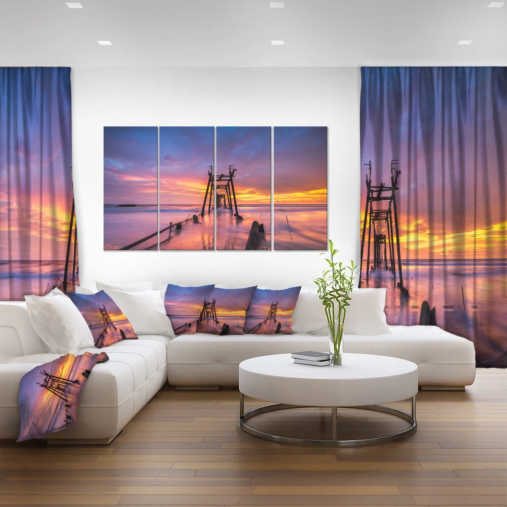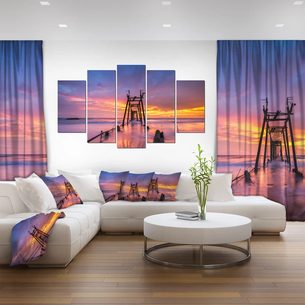 This beautiful Photography Canvas Art is printed using the highest quality fade resistant ink on canvas. Every one of our fine art giclee canvas prints is printed on premium quality cotton canvas, using the finest quality inks which will not fade over time. Each giclee print is stretched tightly over a 1 inch wood sub frame ensuring the canvas is taught and does not buckle. This canvas art print is gallery-wrapped (the design continues on the sides) , giving it a real art gallery feel. All of our canvas prints are carefully packaged, fragile labeling and sturdy boxes to ensure a safe delivery. Every canvas print arrives ready to hang on the wall, with the hanging kits includedPeriod: ContemporaryOrientation: HorizontalSubject: Photography, Architecture, Matching Set, Modern, Decorative, Free Shipping Over $49.99* Details Broken Wooden Bridge at Sunset - Sea Pier and Bridge Wall Art Canvas Product Description: This beautiful Photography Canvas Art is printed using the highest quality fade resistant ink on canvas. Every one of our fine art giclee canvas prints is printed on premium quality cotton canvas, using the finest quality inks which will not fade over time. Each giclee print is stretched tightly over a 1 inch wood sub frame ensuring the canvas is taught and does not buckle. This canvas art print is gallery-wrapped (the design continues on the sides) , giving it a real art gallery feel. All of our canvas prints are carefully packaged, fragile labeling and sturdy boxes to ensure a safe delivery. Every canvas print arrives ready to hang on the wall, with the hanging kits included PeriodContemporary OrientationHorizontal SubjectPhotography, Architecture, Matching Set, Modern, Decorative, Horizontal TypeCanvas Art, Fine Art, Fine Art Giclee, Print, Wrapped MaterialCanvas, Cotton, Wood StylePhotography, Architecture, Matching Set, Modern, Decorative, Horizontal Number of Pieces4+ FramedFramed Exact ColorBlue SizeOversized ColorBlue