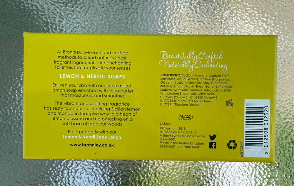 Bronnley New Citrus Lemon and Neroli Soap 3 x 100g (3.5oz.) New Sealed Bags. The box itself does have some visual imperfections to the top. All three bags are still individually sealed with the factory tape. Please check the pictures carefully in order to better gauge the condition of the box. I am willing to bundle deal with multiple purchases. I will provide fast and careful shipping. Thank you for your time. T