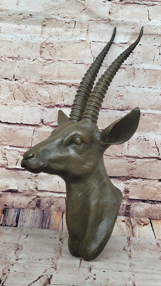 Condition : This sculpture is in perfect condition Bronze Dimensions: Height 16" X Width 8" Weight:8 LBS Inventory:85AL3606458 This stunning bronze gazelle head wall mount captures the essence of a hunter’s trophy, immortalizing the beauty and majesty of this swift and graceful creature. Its lifelike features, crowned by its tall, slender horns, evoke the wild and untamed spirit of the gazelle. This piece serves as a reminder of the animal's natural elegance and agility, making it a striking addition to any space. Known for their remarkable speed, gazelles can reach bursts of up to 60 mph (97 km/h) or sustain a pace of 30 mph (48 km/h). These remarkable animals inhabit the deserts, grasslands, and savannas of Africa, as well as regions in southwest and central Asia and the Indian subcontinent. This sculpture pays tribute to their ability to thrive in such diverse and challenging environments while celebrating their enduring beauty. Handcrafted using the traditional lost-wax casting method, the bronze sculpture is finished with a rich brown patina for preservation and an air of timeless sophistication. Signed by the artist Nick, this piece is a testament to the artistry and skill required to capture the essence of one of nature’s most captivating creatures. Art Deco Original Gazelle Head Bust Trophy Bronze Statue Sculpture Wall Mount Video will open in a new window Using the eBay App? Paste link into a browser window: [isdntekvideo]