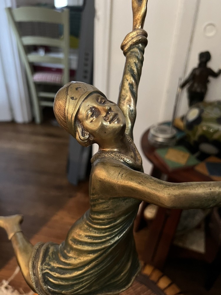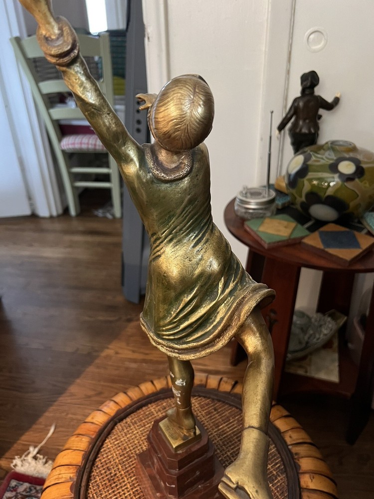 Gracefully capturing the elegance of a skater in mid-pose, this Art Deco ice skater sculpture is a timeless piece that beautifully embodies the chic style of its era. Crafted from high-quality bronze, the sculpture rests atop a polished marble base, enhancing its classical appeal and adding to its overall sophistication.The work is signed, indicating its authenticity and the artist's touch, making it a collectible treasure for enthusiasts and connoisseurs alike. Its striking presence is sure to be a conversation starter, whether placed in a private gallery or as a standout piece in a entryway. It's in wonderful condition, little wear of some of the gold paint on the one calf of a leg, but it could easily be touched up with some gold paint, no breaks, scratches, it's in overall great shape, would be great entryway piece. Artist signed, she is 19" without stand and 23" with marble base.