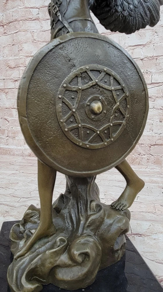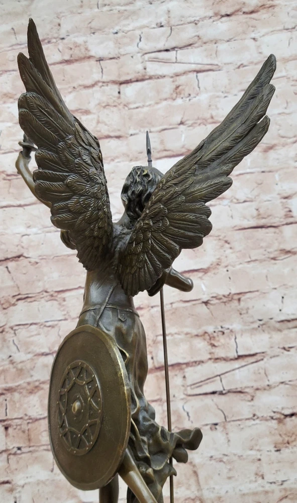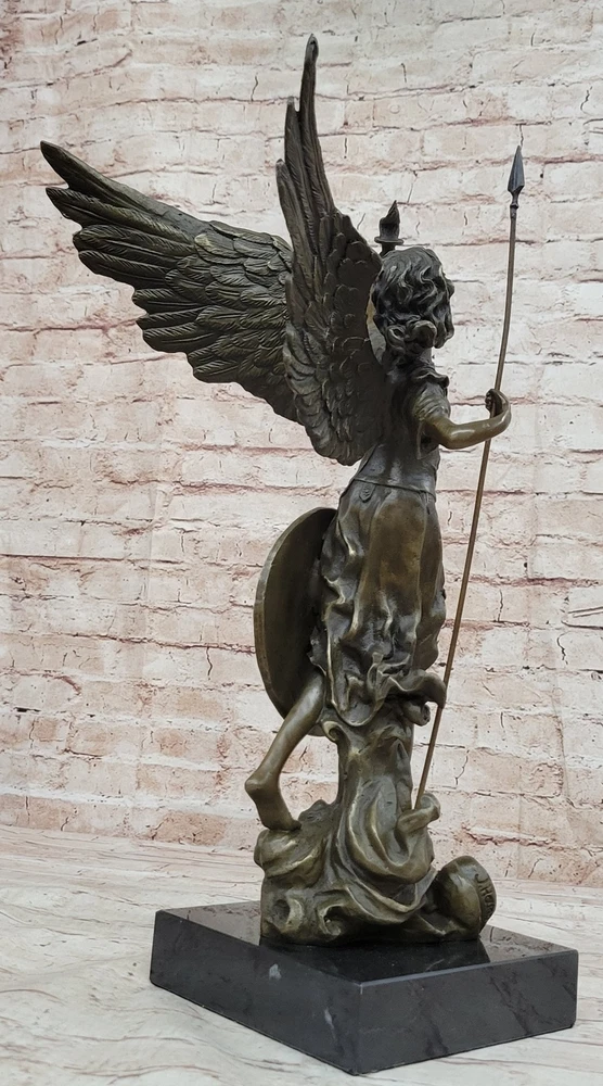 Condition : This sculpture is in perfect condition. Bronze Dimensions with Marble Base: Height 18" X Width 10" Marble Dimensions: Diameter 6" Height without base:17" Weight:17 LBS Inventory:40DS2597902 Embrace the divine presence of the Archangels with this captivating bronze sculpture that embodies the majestic essence of Archangel Gabriel. As one of the foremost hierarchs in the celestial realm, Archangel Gabriel is a harbinger of GOOD NEWS, a divine messenger who carries the voice of God. With a name that means "Hero of God," Gabriel's ethereal guidance brings forth foreknowledge of forthcoming events, transformative changes, and new opportunities. This archangel's radiant energy revitalizes stagnant aspects of life, infusing light into relationships, businesses, and households. Notably, while angelic beings transcend gender, Gabriel has occasionally manifested in a distinct female form, symbolizing the fluidity of divine presence. Crafted with meticulous attention to detail, this exquisite bronze statue portrays Archangel Gabriel prepared for cosmic battle, clutching a sword as a symbol of divine authority. The statue's impressive dimensions of 20 inches in height, 10 inches in width, and 9 inches in depth capture the archangel's formidable presence. Made from solid bronze, the sculpture exudes the essence of luxury and refinement, reminiscent of more expensive bronze artworks. Each stroke of hand-painted accents enhances the sculpture's allure, showcasing the artist's skill in bringing out intricate features. This stunning statue, signed by the accomplished artist Houdon, serves as a meaningful and cherished gift for both family and friends. Embodying the transcendental essence of Archangel Gabriel, it invites divine blessings and protection into the lives of those who possess it. Whether displayed as a centerpiece or a focal point, this bronze masterpiece is a testament to the eternal intercession of the Archangels and a profound addition to any sacred space or collection. 20" Tall Archangels Nike Angel of Victory Mythical Bronze Sculpture Statue Decor Video will open in a new window Using the eBay App? Paste link into a browser window: [isdntekvideo]