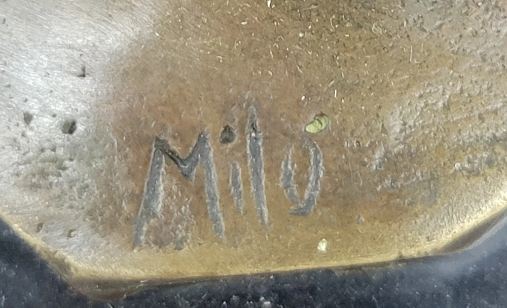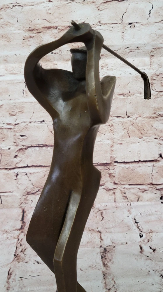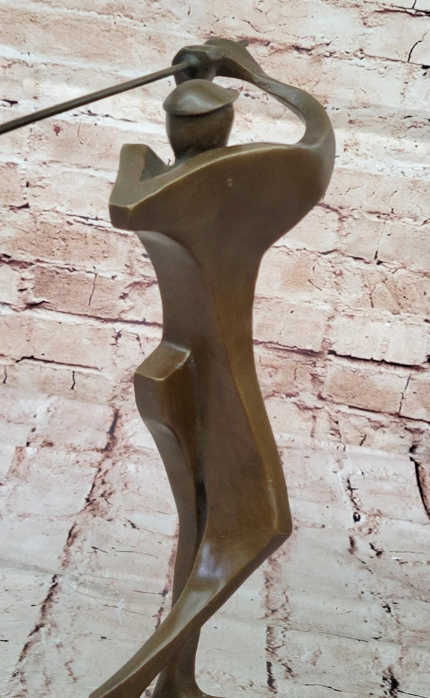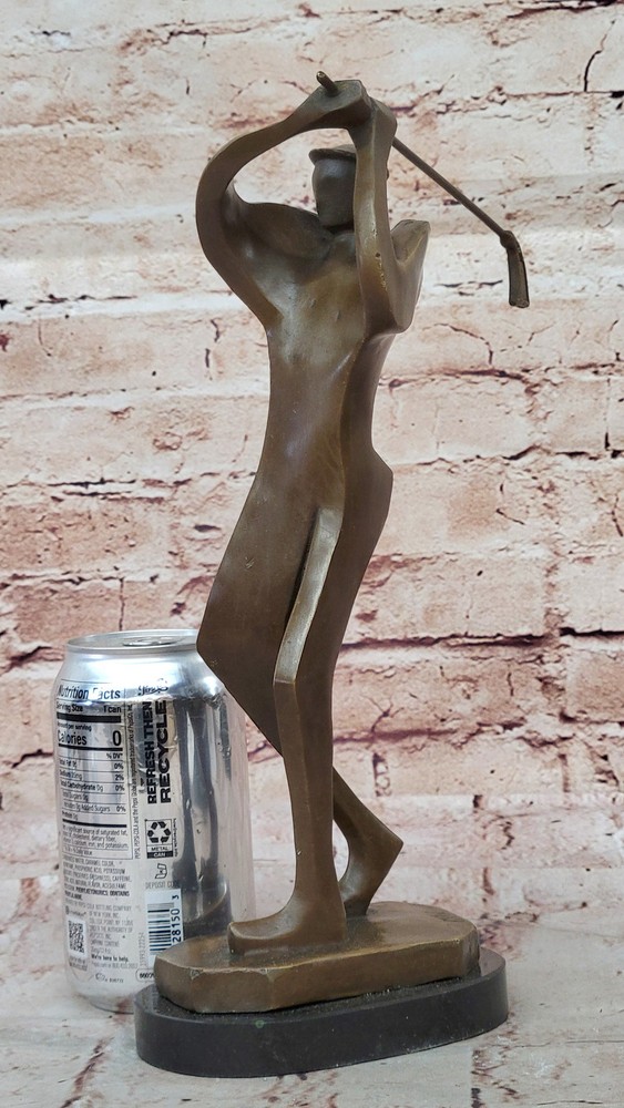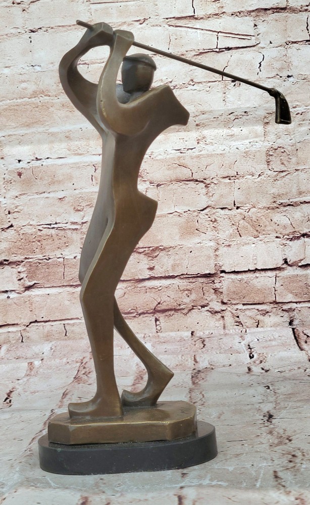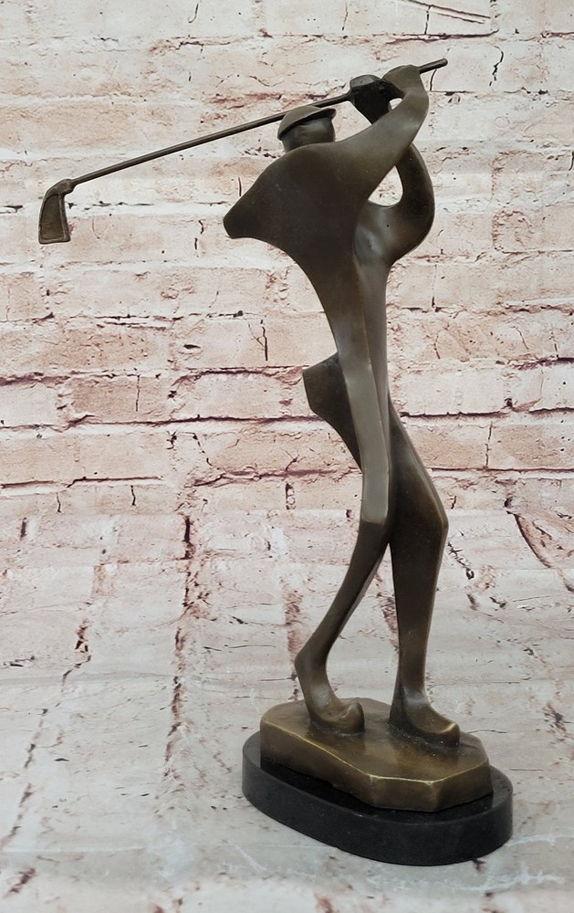Condition : nbsp; This sculpture is in perfect condition. Bronze Dimensions with Marble Base: Heightnbsp;12" X Width 6.5" Marble Dimensions: Diameter 5 1/2" Height without base:11" Weight:5 LBS Inventory:54Y1413245 This abstract bronze sculpture offers a distinctive interpretation of the sport of golf. Rather than depicting a traditional golfer in a typical pose, this piece captures the dynamic motion just after a powerful hit. The bulky athlete, frozen in action, has his club swung back in the air, symbolizing the energy and precision required in the game of golf. This sculpture is a captivating fusion of golf and abstract art, making it a unique addition to any collection. It appeals to both golf enthusiasts and those with an appreciation for abstract forms. Crafted using the time-honored "Lost Wax Method," it exhibits intricate detailing and texture, ensuring its lasting beauty and collectible value. Mounted on a sleek black marble base, this sculpture stands as a testament to the artist's creativity and skill. It is signed by the renowned artist Milo, adding an extra layer of authenticity and desirability for art collectors and golf aficionados alike. Whether displayed in a home, office, or golf clubhouse, this piece is sure to spark conversations and admiration for its artistic and sporting significance. Signed Original Milo Abstract Golf Golfer Golfing Modern Sculpture Statue Art Video will open in a new window Using the eBay App? Paste link into a browser window: [isdntekvideo]