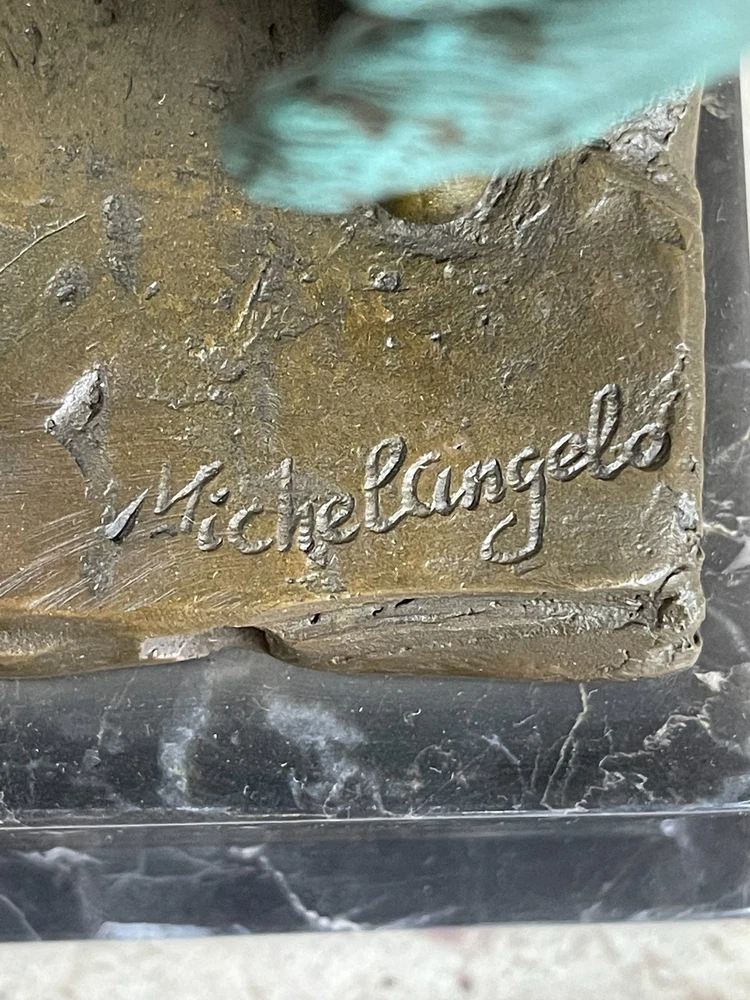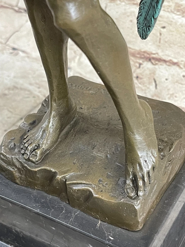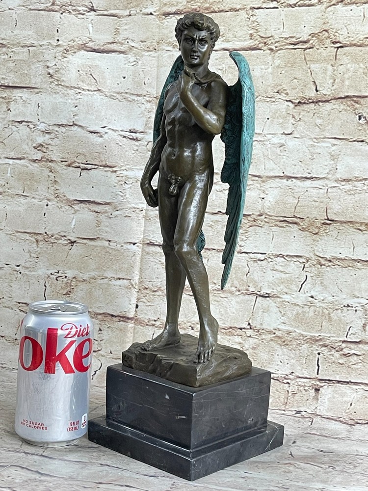 Condition : This sculpture is in perfect condition. Bronze Dimensions with Marble Base: Height 15" X Width 6" Marble Dimensions: Diameter 5" X 5" Height without base:12" Weight:12 LBS Inventory:23EP355B5832 This magnificent bronze statue of David captures the essence of the iconic masterpiece, showcasing his timeless beauty and strength. Standing tall, the nude figure is a testament to the artist's meticulous craftsmanship, with every detail of David's muscular physique meticulously rendered in a rich brown patina. His well-defined abdomen, broad shoulders, and powerful arms are highlighted, underscoring the idealized male form. One of the most captivating features of this sculpture is David's majestic wings. Crafted with intricate detail, his expansive wings, finished in a striking brown and green patina, tuck gracefully behind him, extending down to his calves. The inner feathers of the wings exhibit remarkable craftsmanship, with a transition from smaller feathers at the top to longer, more intricate feathers toward the bottom. This sculpture is a masterful representation of David, the angel, and a true work of art. Crafted with care and precision, this 100% bronze sculpture was created using the ancient "Lost Wax Method." It is mounted on a sleek black marble base, adding to its visual appeal. This extraordinary piece proudly bears the signature of the renowned artist Michelangelo, making it a valuable addition to any art collection or a striking focal point in your home or office. MICHAEL ANGELO NUDE FAIRY MYTHICAL BRONZE SCULPTURE ART DECO HOT CAST FIGURINE Video will open in a new window Using the eBay App? Paste link into a browser window: [isdntekvideo]