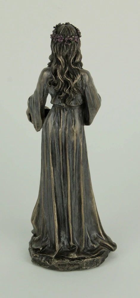 In Norse mythology, Idunn is the goddess associated with youth and apple, she is also the wife of Bragi, the god of poetry. Idunn is the keeper of the magic immortality apples, which the Norse gods must consume to avoid old age. The trickster god Loki once tricked Idunn and kidnapped Idunn to the realm of the giants which caused the other Norse gods to grow old, Loki later rescued Idunn by turning into an eagle and carrying her away in his claws. This beautifully crafted cold-cast bronze statue of Idunn measures 8.5 inches high, 3.25 inches long, and 3 inches wide, and depicts her standing in a dress on a stone path holding a basket of magic apples in her hands, and wearing a crown of pink flowers in her hair. Our eBay Store About Us Add to Favorite Sellers Bronze Finish Idunn Norse Goddess of Spring and Youth Statue OVERALL SIZE - 8.5 Inches High, 3.25 Inches Long, 3 Inches Wide Intricately Sculpted in Cold Cast Bronze with Lifelike Character Showing Fold Lines On the Dress, a Stone Texture On the Base and a Soft Expression On Idunn's Face Polished Bronze Finish with a Grey Color Wash On the Dress and Red On the Apples Depicts Idunn Standing On a Stone Path Holding a Basket of Magic Apples Her Left Hand and One In Her Right, She Wears a Crown of Pink Flowers in Her Long Braided Hair A Beautifully Detailed Work of Art and Makes a Wonderful Gift for Anyone Interested in Norse Mythology In Norse mythology, Idunn is the goddess associated with youth and apple, she is also the wife of Bragi, the god of poetry. Idunn is the keeper of the magic immortality apples, which the Norse gods must consume to avoid old age. The trickster god Loki once tricked Idunn and kidnapped Idunn to the realm of the giants which caused the other Norse gods to grow old, Loki later rescued Idunn by turning into an eagle and carrying her away in his claws. This beautifully crafted cold-cast bronze statue of Idunn measures 8.5 inches high, 3.25 inches long, and 3 inches wide, and depicts her standing in a dress on a stone path holding a basket of magic apples in her hands, and wearing a crown of pink flowers in her hair. Product Details Color Bronze Height 8.5 Length 3.25 Weight 1.05 LB