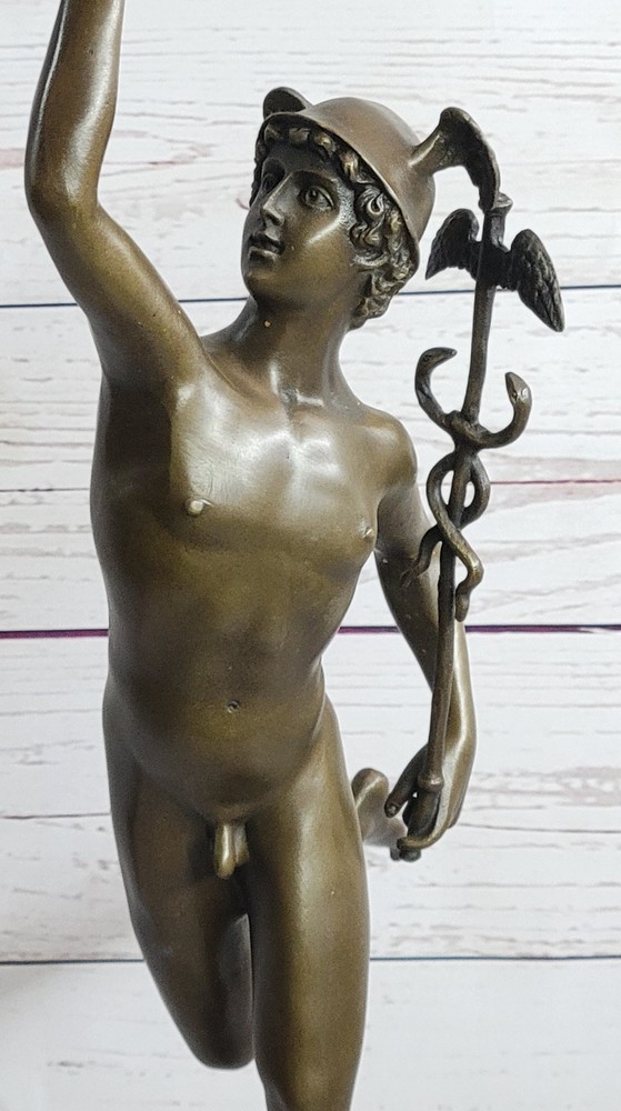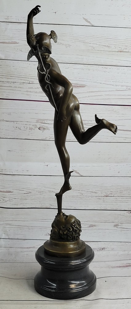 Condition :nbsp; This sculpture is in perfect condition. Bronze Dimensions with Marble Base: Height 23" X Width 13" Marble Dimensions: Diameter 5" Height without base:19.5" Weight: 12 LBS Inventory:90Y2115509 Capture the essence of Giambologna's artistic brilliance with this extraordinary bronze statue. Known for his ability to convey movement and action, Giambologna's Mercury sculpture is a testament to his mastery of form and surface finish. This iconic piece depicts Mercury, the Roman god of commerce and communication, in a moment of poised grace and elegance. Standing on one foot, Mercury is supported by a zephyr, embodying the swift and ethereal nature of the wind. The intricate details of his winged petasus and sandals highlight his ability to travel with great speed. In his hand, he holds the caduceus, symbolizing his connection to the realm of medicine. The statue captures the dynamic energy of Mercury, with his raised arm and poised stance, showcasing Giambologna's skill in creating lifelike sculptures. Crafted using the time-honored "Lost Wax Method," this sculpture ensures the preservation of the original work's quality and intricate details. It stands proudly on a heavy marble base, accentuated with a beautiful bronze trim that adds a touch of elegance and sophistication. The sculpture bears Giambologna's signature, serving as a testament to his mastery and the authenticity of the piece. Own a magnificent piece of art history with this bronze statue, a remarkable representation of Giambologna's artistic genius. Display it in your home or office, and immerse yourself in the timeless beauty and refined elegance that this sculpture embodies. NUDE FLYING MERCURY BRONZE STATUE MARBLE BASE SCULPTURE ART DECO ROMAN MYTHICAL Video will open in a new window Using the eBay App? Paste link into a browser window: [isdntekvideo]