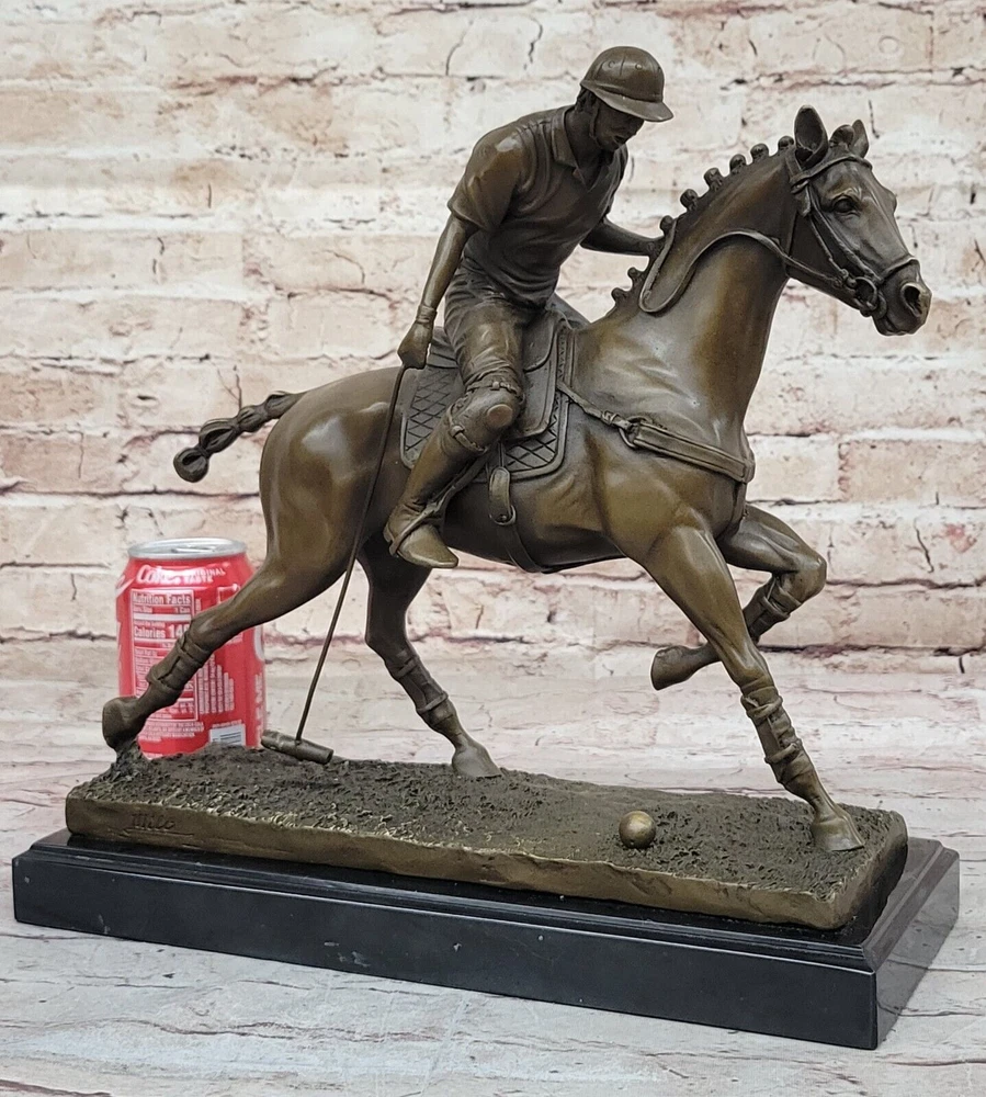 Condition : This sculpture is in perfect condition Bronze Dimensions with Marble Base: Height 12.5" X Width 12.5"nbsp; Marble Dimensions:12.5" X 5.5" Height without base:11.5" Weight:20 LBS Inventory:27B3338472 Experience the exhilarating world of polo with this captivating bronze sculpture that captures the essence of the "Sport of Kings." Swiftly riding through the field on his majestic stallion, the player prepares to strike the ball with a powerful swing of his mallet. This dynamic moment, frozen in bronze, pays homage to the grace and intensity of this revered sport that gained popularity in Britain. Crafted with precision and artistry, the sculpture is a masterpiece made using the ancient and intricate lost wax method. This technique ensures that every detail, from the flowing mane of the stallion to the focused determination of the player, is preserved with unparalleled accuracy. The sculpture stands as a testament to the skill of the artist, signed with the distinguished mark of Milo. As you admire this 100% bronze creation, you are transported to the heart of a polo match, where the synergy between rider and horse is a dance of skill and athleticism. Whether you're a fan of equestrian sports or appreciate the artistry of sculpture, this piece invites you to celebrate the timeless allure of polo and the craftsmanship that brings it to life. Valentines Day Gift. Bronze Statue BRONZE BY MILO POLO PLAYER HORSE SCULPTURE www.bronzhaus.com Video will open in a new window Using the eBay App? Paste link into a browser window: [isdntekvideo]