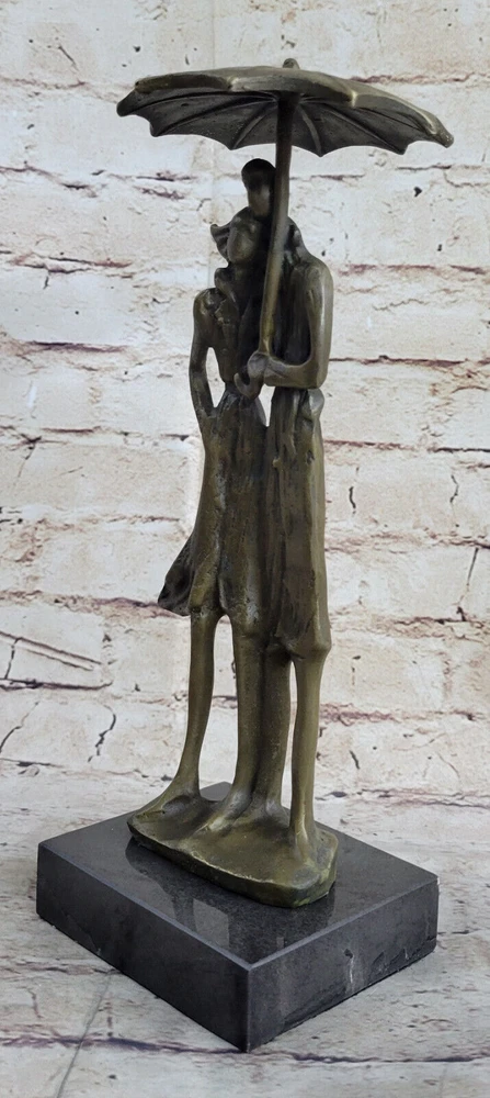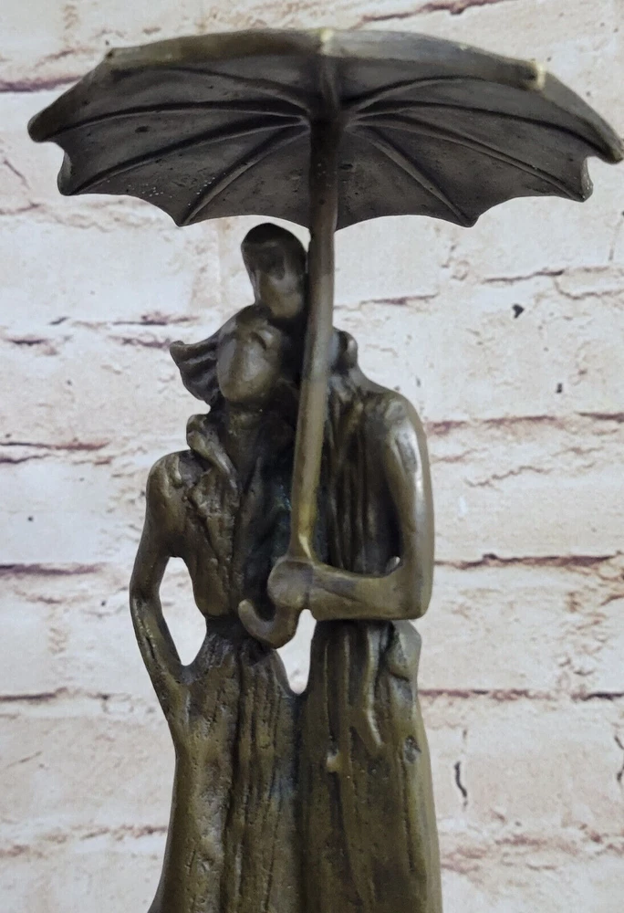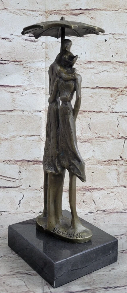 . Condition :nbsp; This sculpture is in perfect condition. Bronze Dimensions with Marble Base: Height 12" X Width 6" Marble Dimensions: Diameter 6" Height without base: 11" Weight: 5 LBS Inventory: 42Y9743224 Capture the essence of romance with this captivating bronze sculpture portraying two lovers seeking shelter under a shared umbrella. The intimacy and closeness between the figures are beautifully depicted, emphasizing their connection and devotion. Meticulously crafted with intricate details, this sculpture showcases the skill and ar tistry involved in its creation. The age-old lost-wax casting method was employed to cast this enchanting piece, a technique renowned for its ability to produce intricate and high-quality bronze sculptures. The finished sculpture boasts a lustrous brown patina, adding depth and warmth to its appearance. Resting on a round black marble base, it exudes an air of sophistication and elegance. This remarkable sculpture is signed by the esteemed artist Aldo Vitaleh, confirming its authenticity and ensuring its value as a collectible artwork. Perfect as a centerpiece in any living space or as a thoughtful gift for a loved one, this bronze sculpture captures the timeless beauty and emotional connection of two souls intertwined in love. Signed Original Aldo Vitaleh two Lovers in Rain Bronze Sculpture Statue Figurine www.bronzhaus.com Video will open in a new window Using the eBay App? Paste link into a browser window: [isdntekvideo]