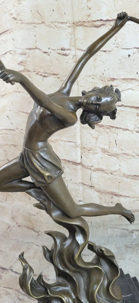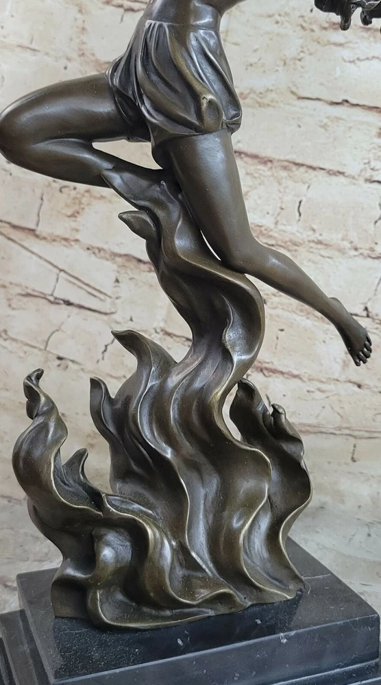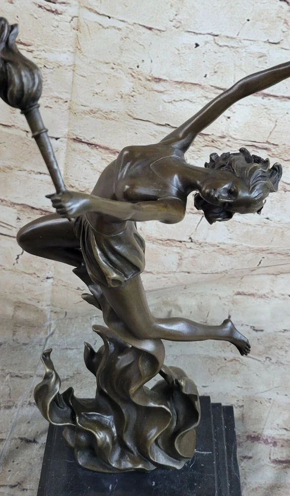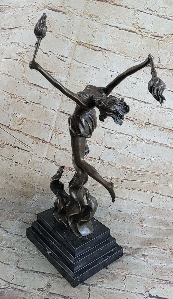 Bronze Sculpture The Flame Leaper Art Deco Woman Torch Dancer Fire Dancer Deal Bronze Sculpture The Flame Leaper Art Deco Woman Torch Dancer Fire Dancer Deal Condition : This sculpture is in perfect condition Bronze Dimensions with Marble Base: Height 17.5" X Width 11" Marble Dimensions:7" X 5" Height without base:15" Weight:13 LBS Inventory:84EPA0758148 This dynamic Art Deco bronze sculpture captures the captivating energy of a fire dancer in motion, inspired by the iconic work of Mario Nick. The figure, poised with torchlights in hand, embodies movement, grace, and the bold style of the Art Deco era. Crafted entirely from genuine bronze with meticulous attention to detail, this sculpture showcases the artist's mastery of form and expression. Mounted on a polished black marble base, the piece exudes sophistication and timeless appeal, making it a striking focal point in both classic and contemporary interiors. Each sculpture is individually handcrafted using the traditional lost wax casting method, ensuring lasting quality and artistic integrity. Due to the natural variations in marble and the handcrafted nature of bronze casting, each sculpture is truly one of a kind—adding to its exclusivity and collectible value. Signed by the artist, this exceptional artwork promises lasting enjoyment and elegance for any art lover or interior setting. Fire Dancer Girl Dancing with Torches Bronze Metal Sculpture Statue Figure Marble Base EPA-075 Video will open in a new window Using the eBay App? Paste link into a browser window: [isdntekvideo] Shipping Terms : Most of our items are shipped via USPS (United States Postal Service) mail or UPS. Most orders are shipped within 24-48 hours of purchase. Please be aware that not all items are available for USPS shipping due to size and weight. We do ship to Hawaii, Alaska, Canada, Puerto Rico, APO/AE, and U.S. Virgin Islands, however, an additional charge may be required. Please contact us before making any purchases in these areas. For Non-USA customers, you may be responsible for all duty, tax, brokerage fees that may be due upon delivery (shipping costs cover freight charges only). We also ship internationally. Please refer to the "Shipping and Handling" chart for the rates for each area. Payment : We accept just about any form of payment. PayPal, Master Card, Visa or American Express credit cards. Money orders, cashiers checks, and even personal or business checks. For governmental institutions, we will also accept a purchase order. Please understand that for personal or business checks we have to wait for the check to clear (usually 7 days) before shipping. Condition : New Detailed Hand Crafted Hot Cast Bronze Satisfaction Guaranteed. This is Stock Photo, Slight Color Variation!! Listing and template services provided by inkFrog