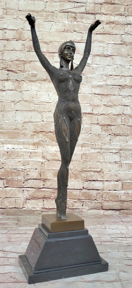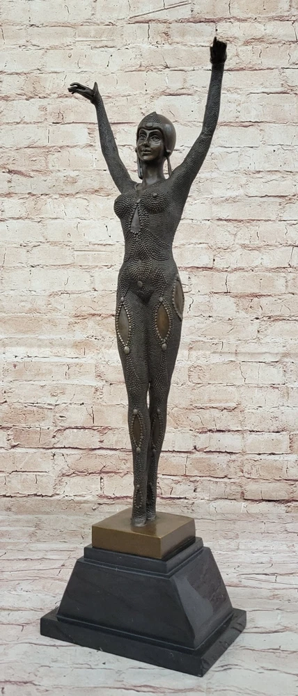 . Condition : This sculpture is in perfect condition. Bronze Dimensions with Marble Base: Height 26" X Width 8" Marble Dimensions:8" x 5" Height without base:23" Weight:20 LBS Inventory:37EP0409073 This exquisite bronze reproduction pays homage to the Art Deco period with a stylish and beautiful figure inspired by the work of D.H. Chiparus. Crafted from solid bronze, the sculpture features a dark patina on the face and a striking gold patina on the body, creating a visually captivating contrast. Employing the "Lost Wax Method," the sculpture showcases meticulous craftsmanship and attention to detail. This traditional casting technique allows for the preservation of intricate elements, ensuring a high level of artistry and authenticity in the reproduction. The use of a heat-applied patina and "hot painted" accents adds depth and dimension to the overall design. Mounted on a substantial marble base with a bronze trim, the sculpture not only stands as a beautiful art piece but also exudes a sense of sophistication and luxury. The signature of D.H. Chiparus further authenticates the reproduction, acknowledging the influence and inspiration drawn from the renowned Art Deco sculptor's work. Whether displayed as a standalone statement or as part of a broader collection, this sculpture captures the essence of the Art Deco era with elegance and finesse. VINTAGE DOURGA BY D.H CHIPARUS BRONZE STATUE SCULPTURE FIGURE ART FREE SHIPPING www.bronzhaus.com Video will open in a new window Using the eBay App? Paste link into a browser window: [isdntekvideo]