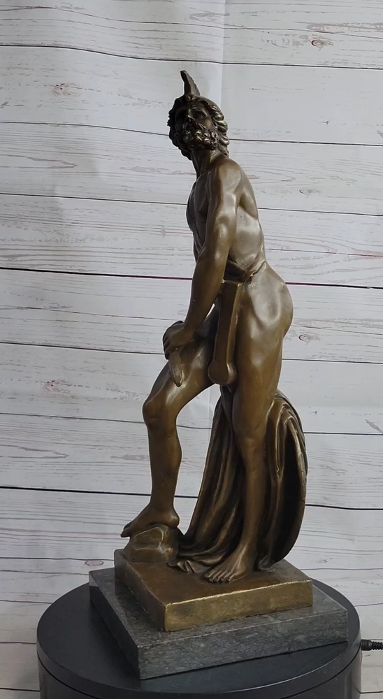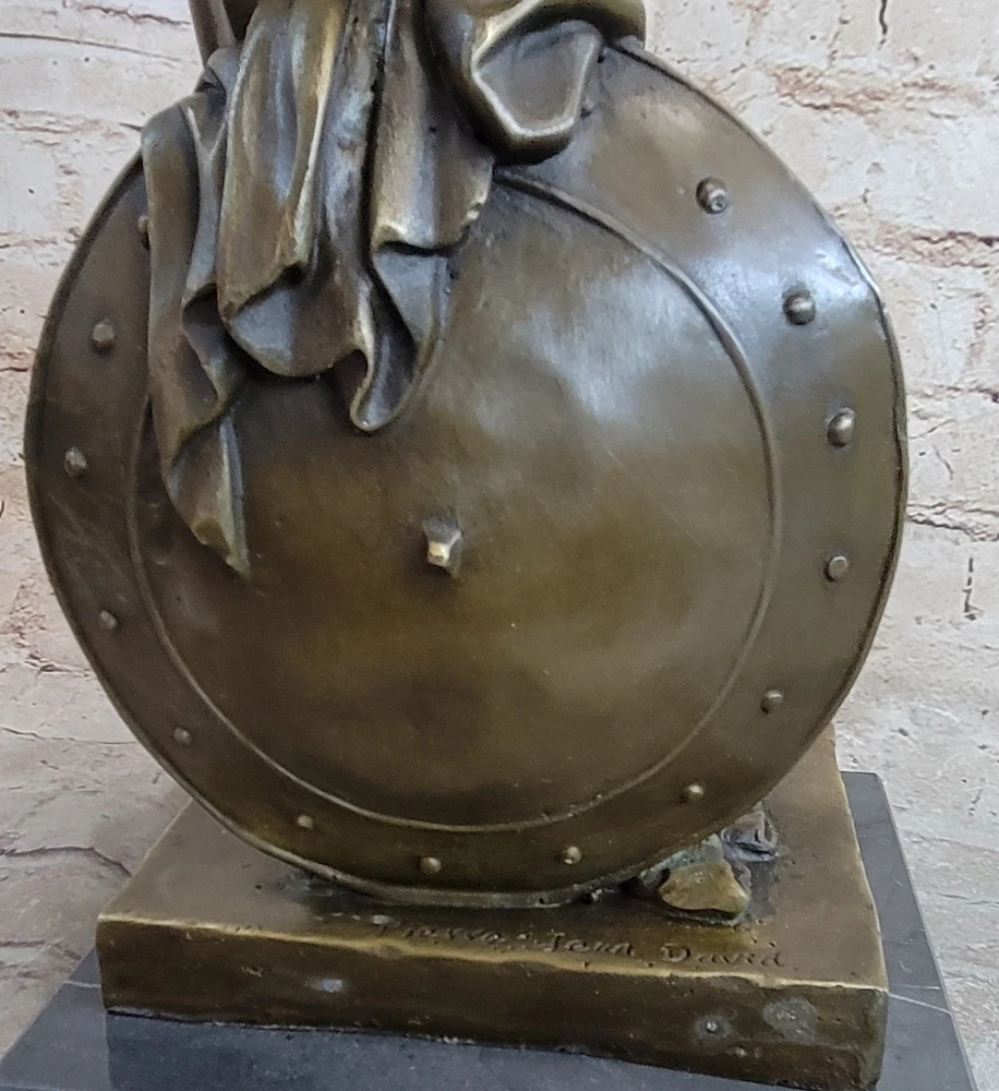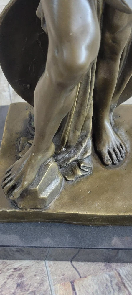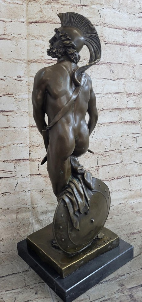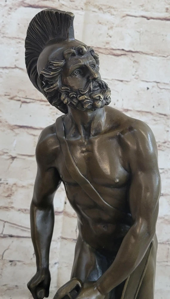. Condition: This sculpture is in perfect condition Bronze Dimensions with Marble Base: Height 21" X Width 7 1/2" Marble Dimensions:7 1/2"nbsp;X 7 1/2" Height without base:20" Weight:23 LBS Inventory:85X082213558 nbsp; Transport yourself to the ancient Roman battlefield with this awe-inspiring bronze sculpture of a noble legion soldier. Standing proudly, he gazes upon the scarred horizon, his body partially adorned with symbolic regalia. Atop his head rests a galea, the traditional helmet of a Roman soldier, while a leather baldric crosses his chest, serving as a belt for carrying weaponry. The paludamentum, a cloak fastened to his shoulder, gracefully drapes down his back, flowing between his legs. Focused on the task at hand, the soldier leans against his shield, meticulously tending to his weapon. The intricate details of the sculpture beautifully capture the spirit and dedication of a Roman legionnaire. Meticulously crafted using the ancient technique of lost-wax casting, this bronze sculpture showcases the mastery of the artist. A brown patina finish further enhances its timeless beauty and durability. The sculpture is elegantly mounted on a black marble base, proudly bearing the signature of the talented artist, Pierre. Greek Warrior Hero Achilles Hercules Odysseus Mythology Bronze Statue Sculpture Figure XN-0822 Video will open in a new window Using the eBay App? Paste link into a browser window: [isdntekvideo]
