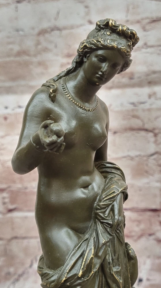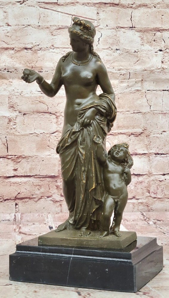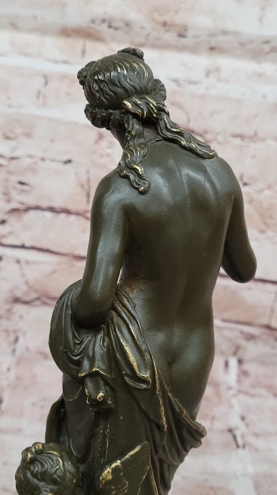 Romantic Bronze Sculpture Statue Venus with Cupid Greek Myth Figurine Deal Art Romantic Bronze Sculpture Statue Venus with Cupid Greek Myth Figurine Deal Art Condition : This sculpture is in perfect condition. Bronze Dimensions with Marble Base: Height 11" X Width 5.5" Marble Dimensions:5.5" X 4" Height without base:10" Weight:6 LBS Inventory:17GTS2076671 This elegant bronze sculpture captures the timeless beauty of Venus, the Roman goddess of love, accompanied by Cupid, her playful and mischievous son. Venus is portrayed with classical grace, her flowing form embodying both femininity and divine allure. Beside her, Cupid clings affectionately, adding charm and emotional depth to the composition. Handmade using the traditional lost wax method, this piece reflects exceptional craftsmanship and artistic sensitivity. The rich brown patina adds warmth and enhances the fine detailing in their hair, drapery, and expressions, bringing the mythological figures vividly to life. Signed by Jean Patoue, the sculpture is securely mounted on a polished black marble base, offering a striking contrast and a touch of sophistication. This captivating piece is perfect for lovers of classical mythology, fine art, or those looking to add a romantic and elegant focal point to their space. Shipping Terms : Most of our items are shipped via USPS (United States Postal Service) mail or UPS. Most orders are shipped within 24-48 hours of purchase. Please be aware that not all items are available for USPS shipping due to size and weight. We do ship to Hawaii, Alaska, Canada, Puerto Rico, APO/AE, and U.S. Virgin Islands, however, an additional charge may be required. Please contact us before making any purchases in these areas. For Non-USA customers, you may be responsible for all duty, tax, brokerage fees that may be due upon delivery (shipping costs cover freight charges only). We also ship internationally. Please refer to the "Shipping and Handling" chart for the rates for each area. Payment : We accept just about any form of payment. PayPal, Master Card, Visa or American Express credit cards. Money orders, cashiers checks, and even personal or business checks. For governmental institutions, we will also accept a purchase order. Please understand that for personal or business checks we have to wait for the check to clear (usually 7 days) before shipping. Condition : New Detailed Hand Crafted Hot Cast Bronze Satisfaction Guaranteed. This is Stock Photo, Slight Color Variation!! Listing and template services provided by inkFrog