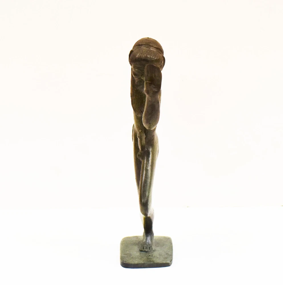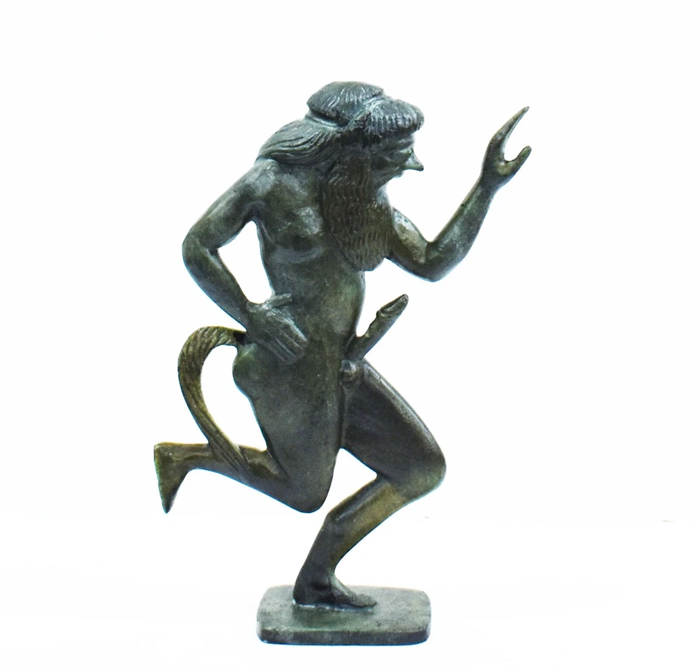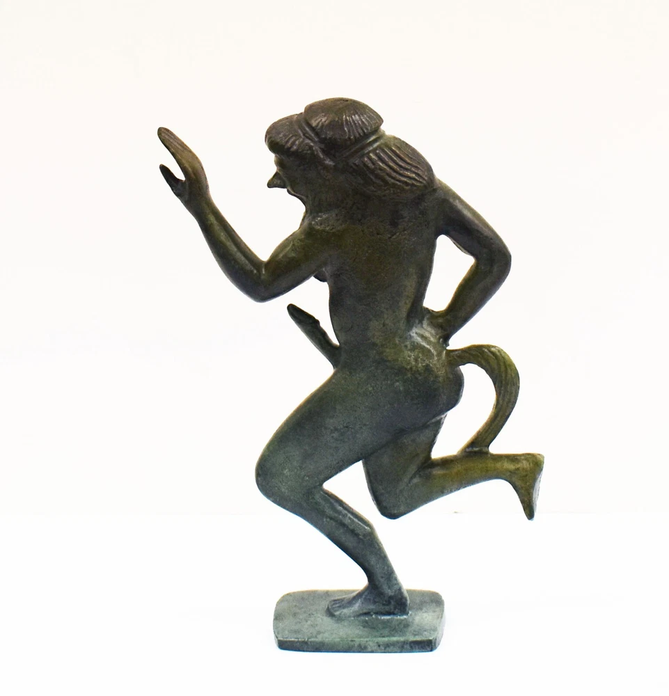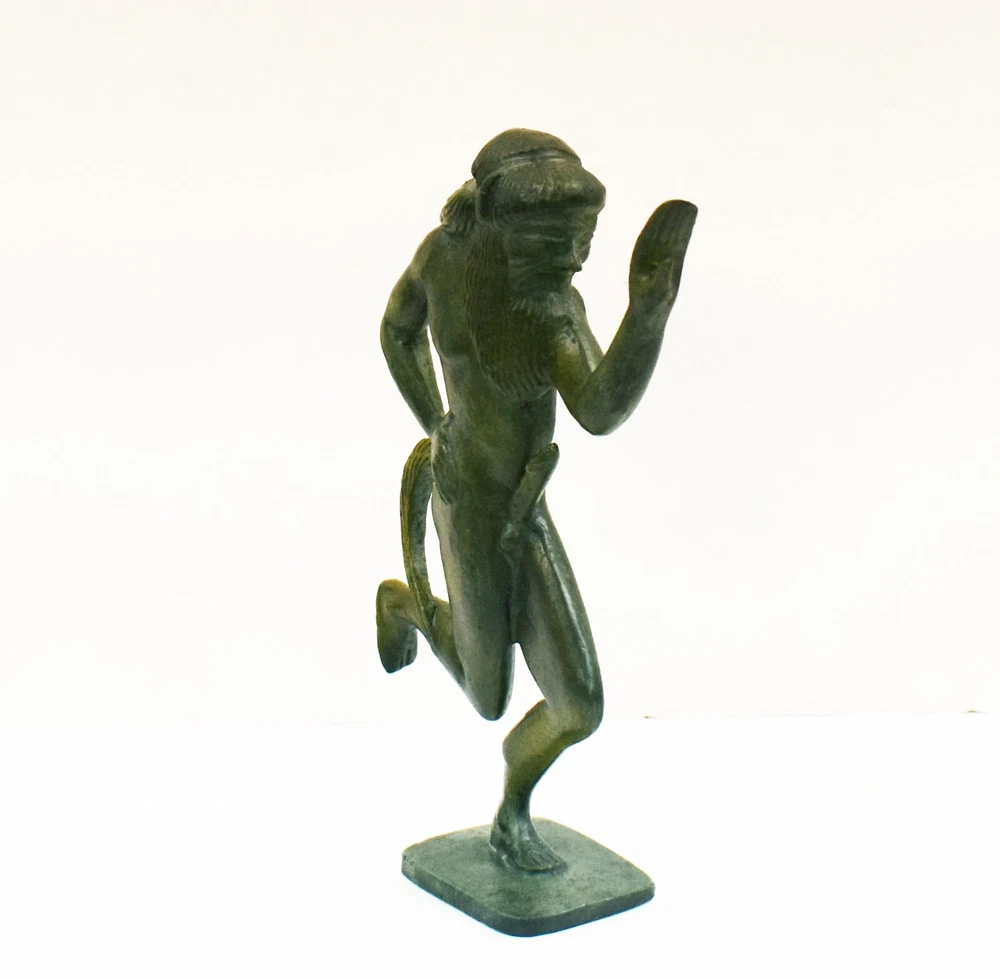 SATYR BRONZE FIGURINE Satyrs are figures from Greek mythology who were followers of the god of wine Dionysus and who were often guilty of excessive sexual desires and overindulgence of wine. Men with a horse's tail and ears or men with goat legs, these shaggy and unruly creatures lived wild in the forests and symbolized the dangers of unrestraint. Satyrs are frequently depicted in ancient art, typically causing havoc by attacking women and performing lewd tricks with wine cups. They could be more industrious when Dionysus put them to work making wine. The most famous individual satyr is wise old Silenus, who was the tutor of Dionysus. All our bronze items, are cast in Greece, using the traditional 'lost wax' method. As nothing is mass-produced, there will inevitably be slight variations in patination and colouring. Each piece is, therefore, unique.(112200194301-A) Details: Condition: New, Handmade in Greece Material: Pure Bronze Height: 19 cm(7.5 inches) Width : 12 cm(4.7 inches) Weight : 1.2 kg