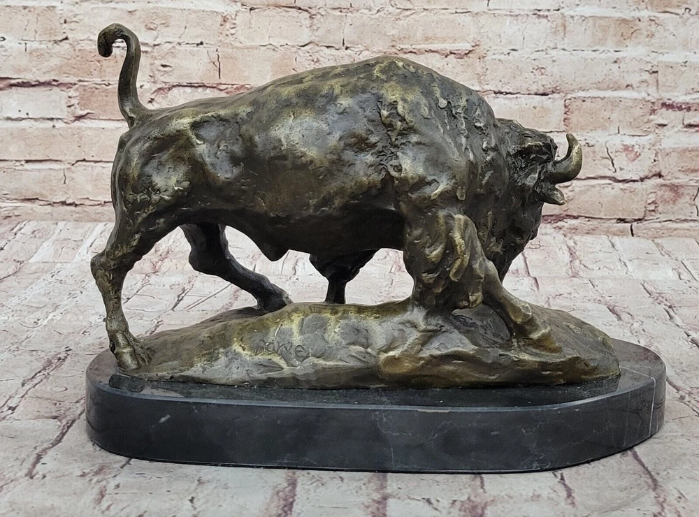 Condition : This sculpture is in perfect condition. Bronze Dimensions with Marble Base: Height 8" X Width 14" Marble Dimensions: Diameter 13" Height without base:7" Weight:13 LBS Inventory:35Y5856353 Introducing the awe-inspiring "Solid Bronze American Buffalo Statue Figure on Marble Base" by the acclaimed artist Barye. This remarkable sculpture captures the majestic essence of the iconic American buffalo, a symbol of strength, resilience, and the untamed spirit of the Wild West. Crafted with exceptional artistry, this solid bronze statue exhibits intricate details that bring the buffalo to life. From the powerful muscles to the finely textured fur, every aspect of this sculpture showcases the artist's dedication to capturing the essence of this magnificent creature. The brown patina finish adds depth and richness, accentuating the intricate details and lending an air of timelessness to the piece. Mounted securely on a marble base, this sculpture exudes elegance and serves as a solid foundation for the buffalo's presence. The combination of the sturdy bronze and the luxurious marble base creates a visually striking contrast, elevating the overall aesthetic appeal of the artwork. Created using the time-honored lost wax method, this sculpture represents the culmination of meticulous craftsmanship. This traditional technique ensures that each piece is a unique work of art, faithfully preserving the artist's vision and attention to detail. Immerse yourself in the spirit of the American West with this extraordinary bronze buffalo statue. Whether you are an avid art collector, a lover of wildlife, or simply seeking a statement piece to adorn your space, this sculpture is sure to captivate and inspire. Embrace the untamed spirit of the American buffalo and bring a touch of wilderness into your home or office with this exceptional artwork. Signed American Buffalo Bull Bronze Sculpture by Barye on Marble Base Figure Art www.bronzhaus.com Video will open in a new window Using the eBay App? Paste link into a browser window: [isdntekvideo]