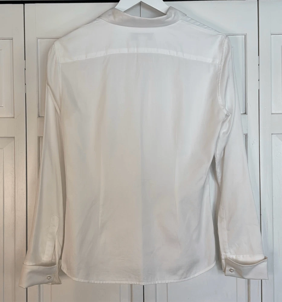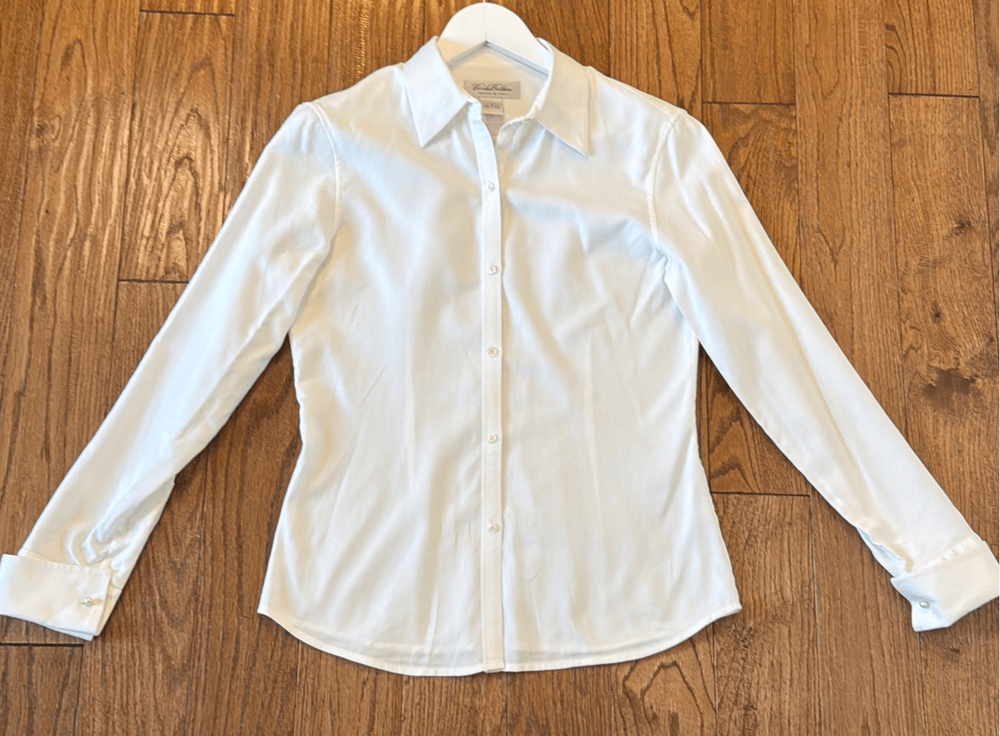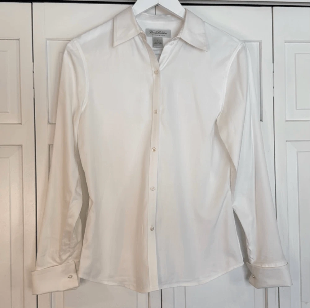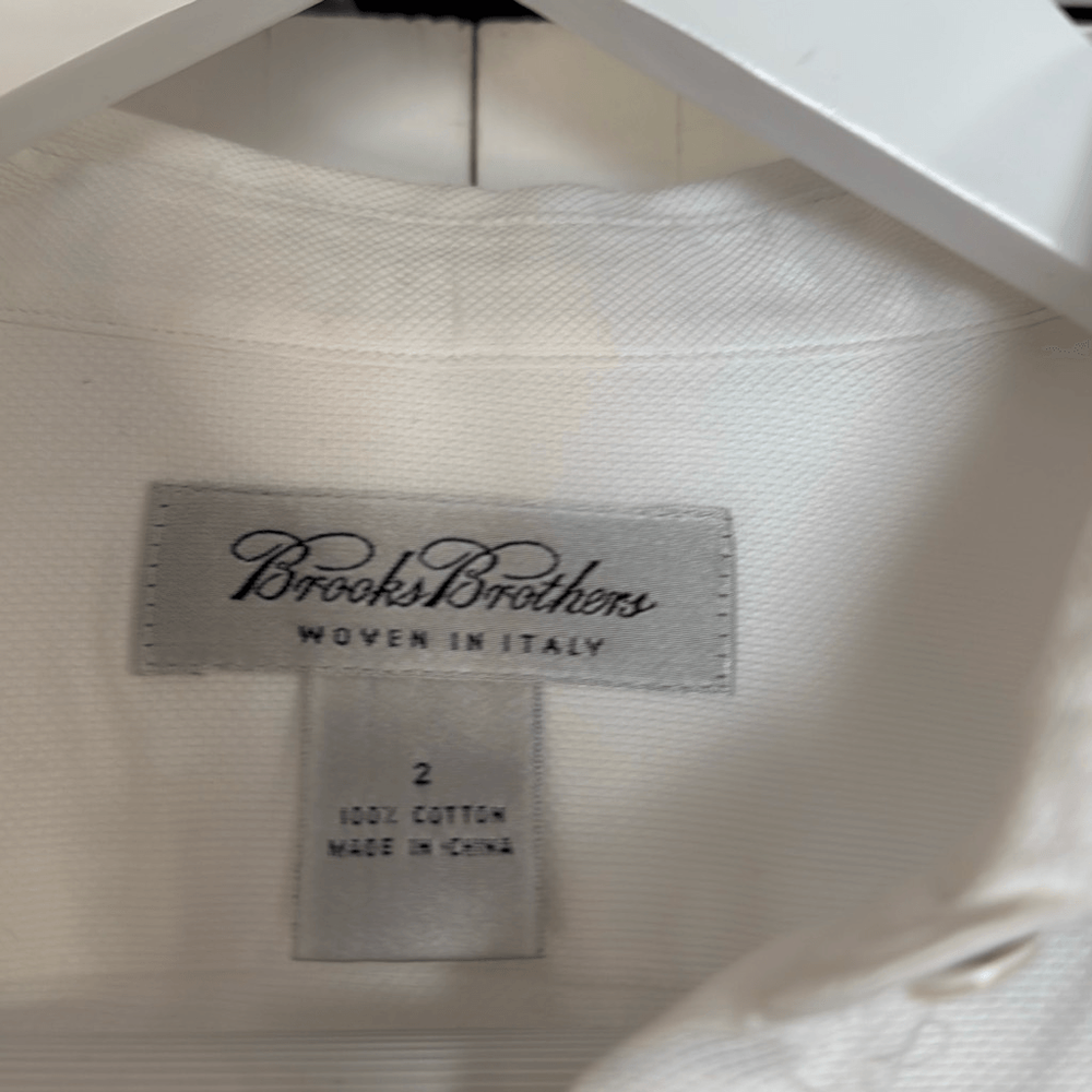 Brand: Brooks Brothers Description: 100% cotton woven in Italy pearl cuff button down Size: 2 Color: white Condition: Gently Worn Very Good ๐๐ป Measurements: Pit to pit: 17โ Length: 24โ **Bundle and Save!!** all measurements are approximate and taken laying down C5