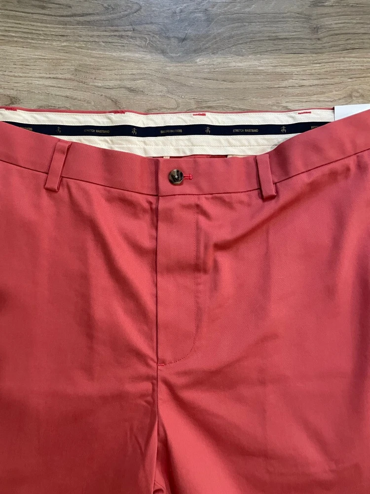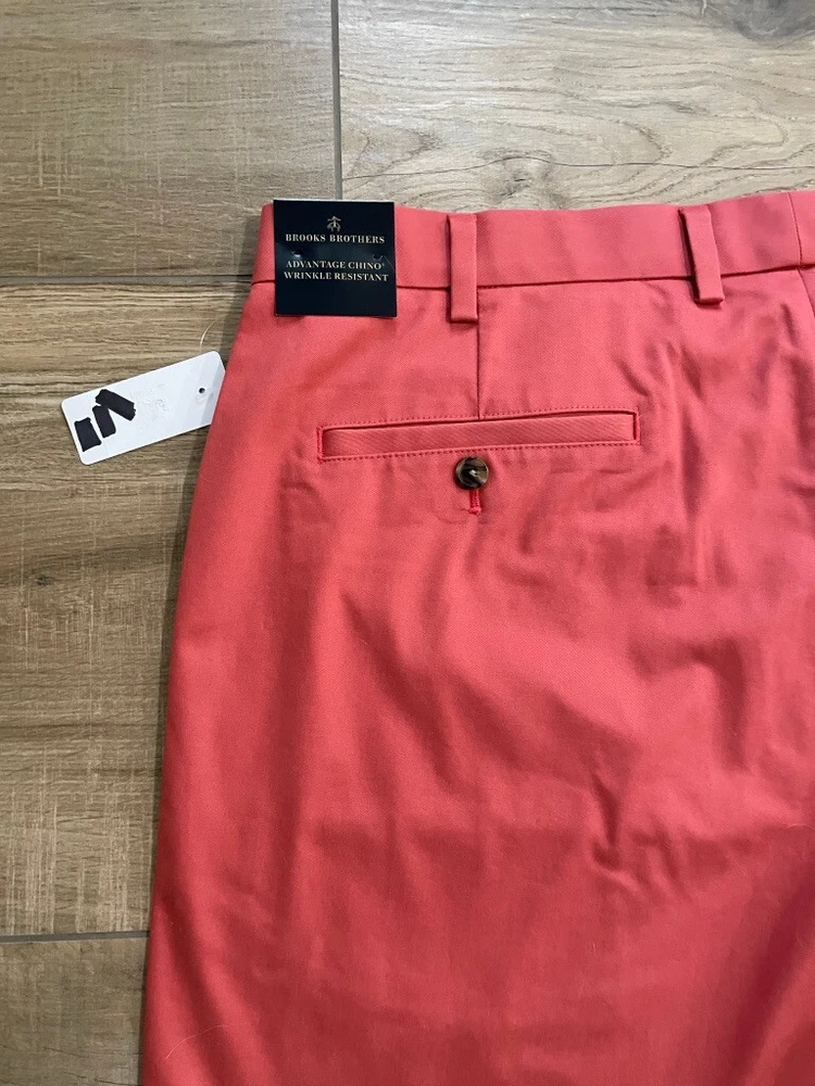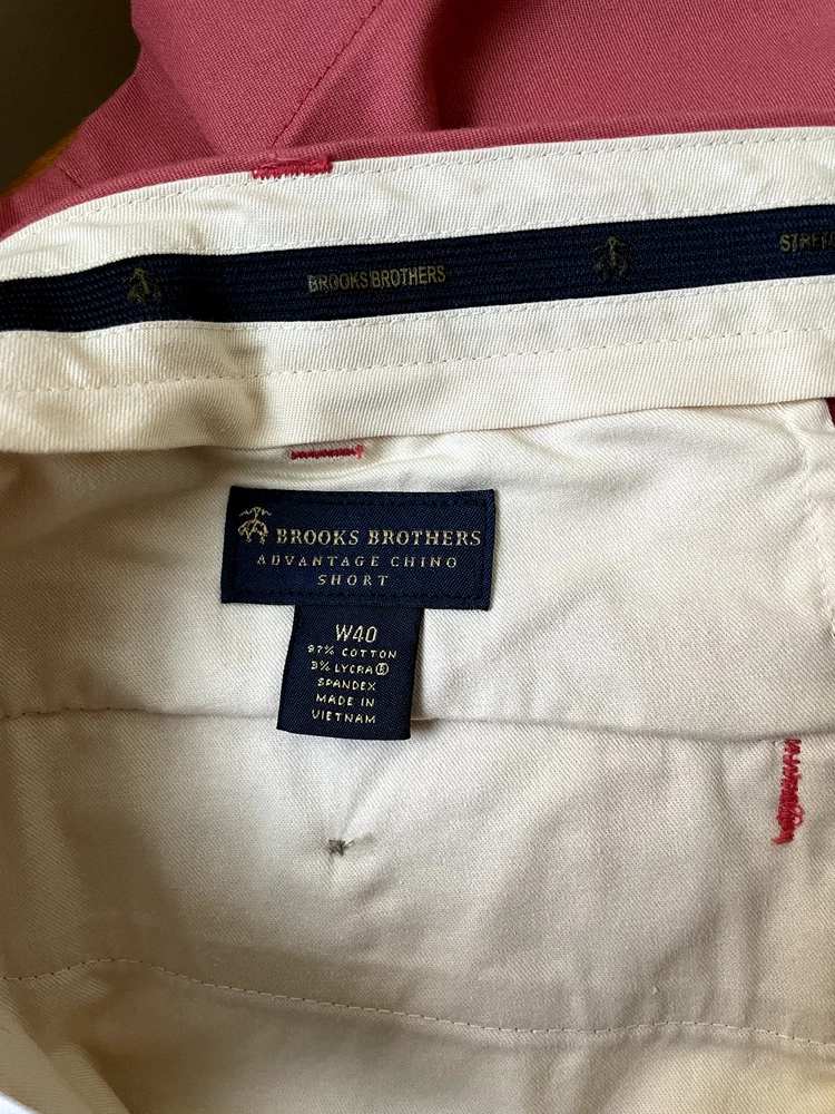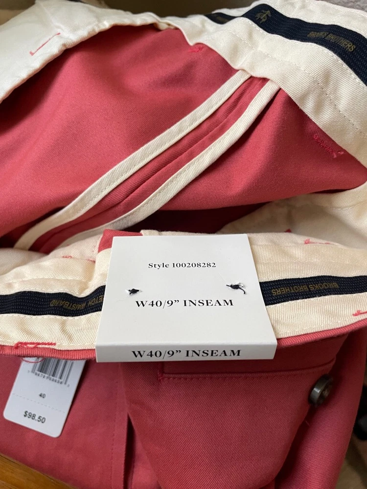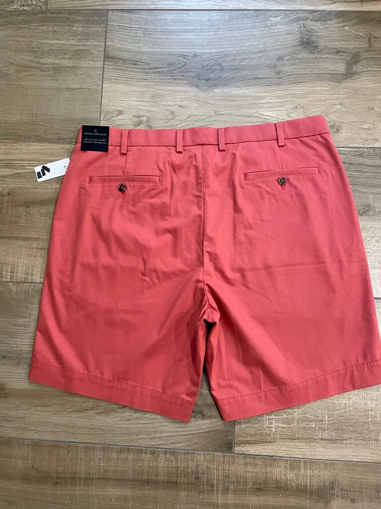 Brooks Brothers Advantage Chino Short Style: 9" Flat front classic Short Color: Dusty red pink Fabric: 97% Cotton, 3% Lycra Features: Zip & button fly, slit pockets, buttoned back pockets, flat front Approximate flat measurements: Waist 20 1/2", Rise 12 1/2", Inseam 9" Condition: New with tags, originally $98 Size: Tag size 40