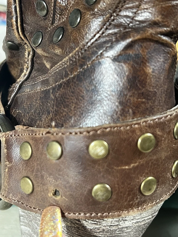 Preowned in good condition. Missing 3 studs - please see pictures Colors may vary from screen to screen I do my best to remove any clothing /items / shoes with excessive wear, stains or marks. comes as shown Please keep in mind that it is used , so can show minor wear . Note: When buying vintage, retro, antique, or preowned expect normal wear and tear Please see photos as they are considered part of the description.. item needs cleaning to your liking SEE PHOTOS COMES EXACTLY AS PICTURED*** This piece shows minor signs of age/wear and is priced according to condition. Please see pictures for approximately measurements. To prevent returns and insure fit : please inspect the photos and compare the measurements to your clothes / shoes Zoom in to inspect and judge for yourself. The photos are part of t in he item condition description. Any flaws that can be seen in the photos are part of the description and will not be considered misrepresented.