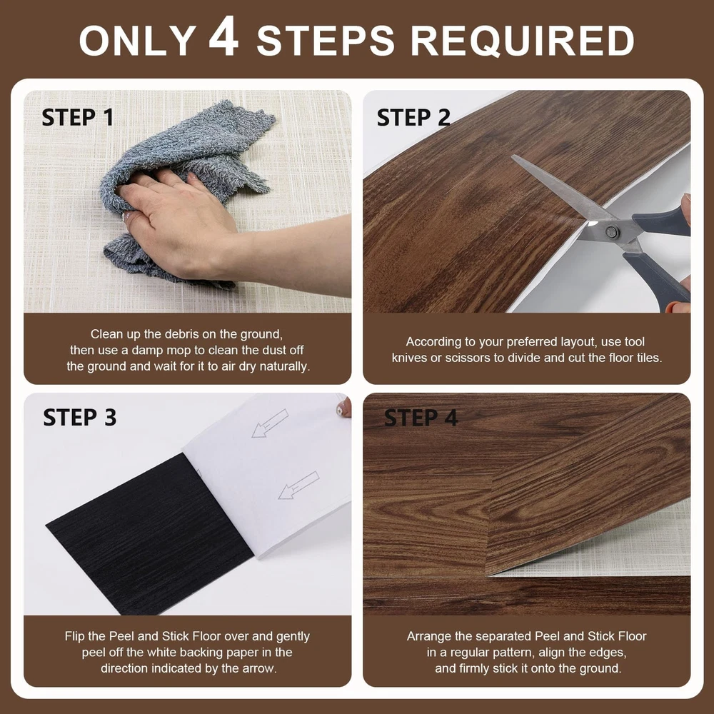 Absolutely love these peel-and-stick tiles! They’re super easy to install—just peel and press, no mess or extra tools. The wood-look vinyl is thick, waterproof, and feels durable underfoot. Perfect for a quick upgrade to any room. Stays put without curling, and the rich brown color looks high-end. Highly recommend for a hassle-free DIY flooring solution!