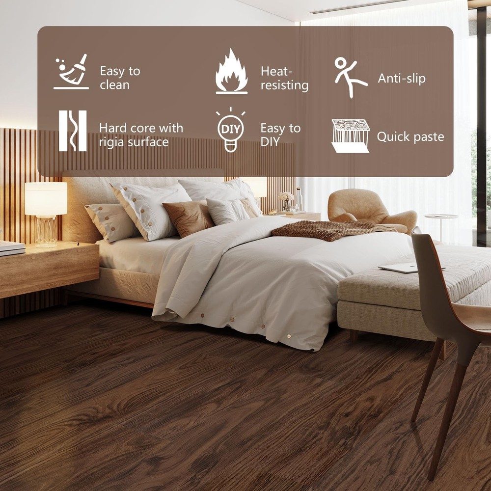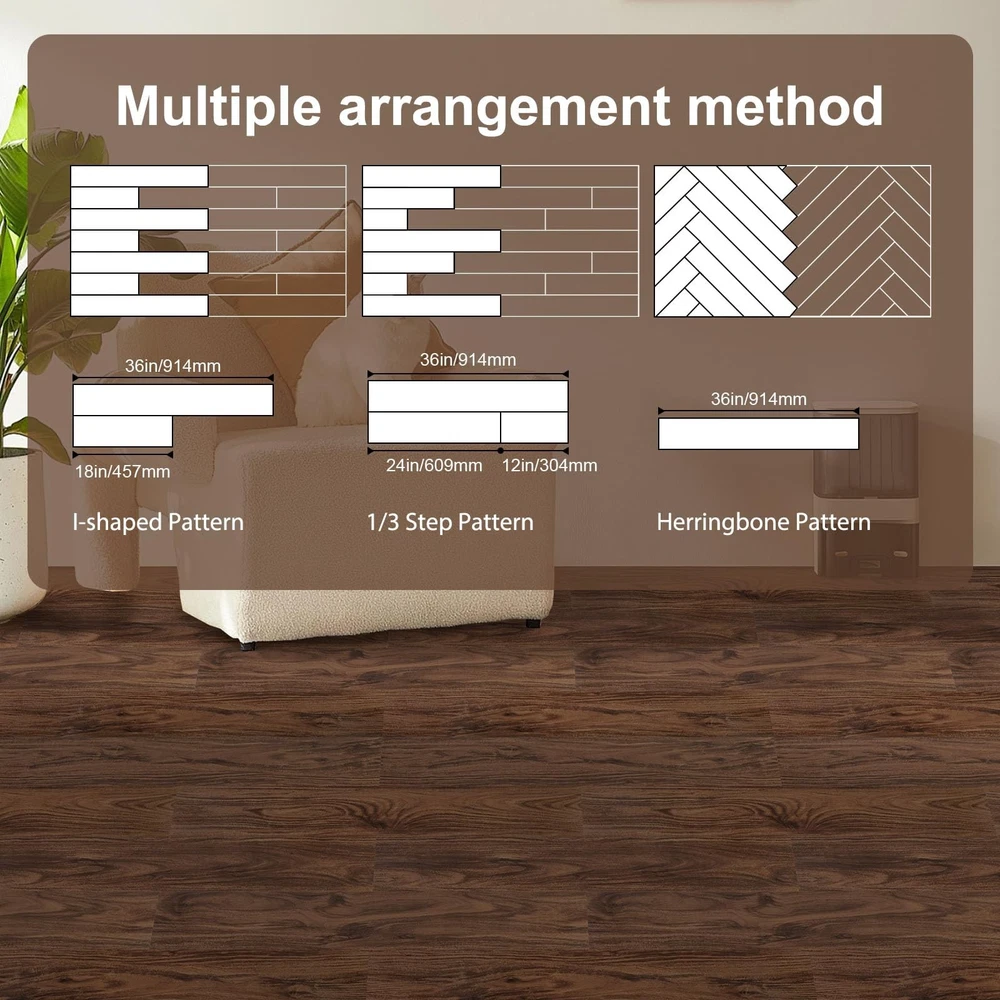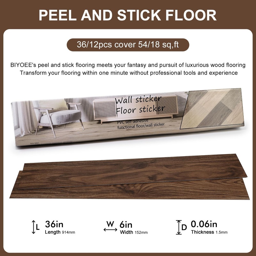 Peel and Stick Floor Tiles 【Size】:Peel and stick floor tiles measure 36“ x 6” each and are 1.5mm thick, with the entire package covering 54 square feet 【Material】:Brown wood plank is made of high-strength vinyl that has been specially treated to be waterproof, durable, abrasion-resistant, tear-resistant, and won't crimp, even after prolonged use 【Easy to Install】:Vinyl floor tiles are easy to install and remove, no extra glue or tools needed, just cut as needed and peel off the back sticker. Better results when pressed 【Multi-Scenario Application】:Self-adhesive tiles are both aesthetically pleasing and protective, making them ideal for use in bedrooms, bathrooms, living rooms, kitchens, toilets and more 【Warm Tips】:Vinyl wood planks should have a flat and dry surface before pasting, otherwise it will affect the pasting effect. Please buy enough quantity at one time and make sure it comes from the same batch to avoid color difference