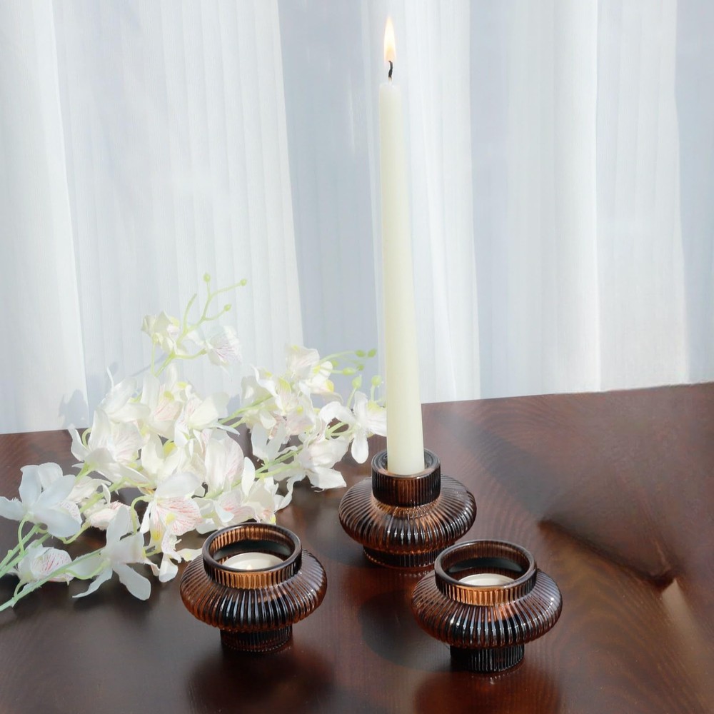 [Brownish Amber Candlestick Holders]: these are colored inventively under elegant shape. You expect to set them home decor, or outdoor for natural theme party buffet, Fall wedding, forest holiday gathering [Rustic Candle Holder Boho Decor]: the amber candle holders are pleasant partner for warm centerpiece table decorations, farmhouse living room/bathroom, decking out Halloween/Thanksgiving/Christmas [Textured Candle Stick Candle Holder]: taper tealight candle holder selects high-quality clean glass, with enough weight(0.54lb) to hold down candle sticks or table runners without being toppled over [Affordable and Perfect Gifts]: for her/him by splitting up the 6pcs tapered candlestick holders as favors for friends or mates on important occasions like Birthday, anniversary, festival, house-warming, or for yourself having fun [Versatile for Tea lights/Taper Candles]: cute size with 3.15x2.36 inch taking up less space; the fluted glass, when using taper top gives little pizazz without being too fussy, while lighting tea lights gives relaxing atmosphere