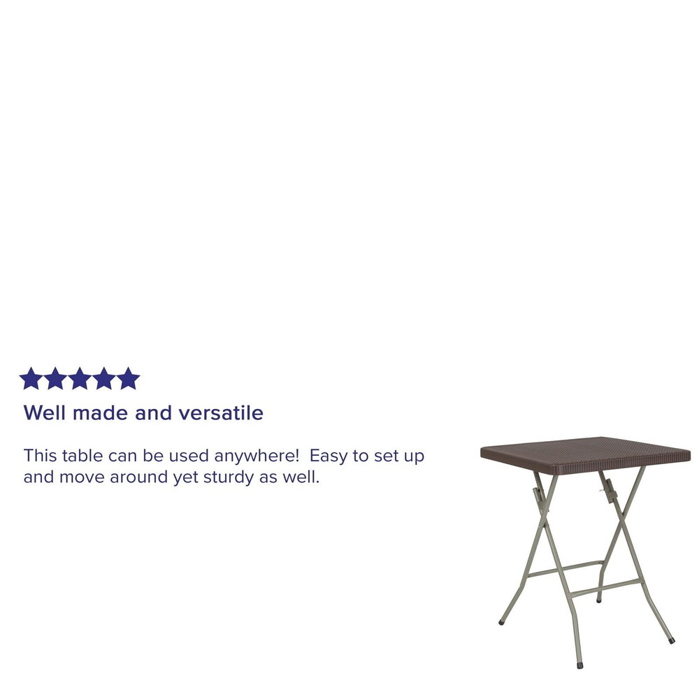 You may also like Mid Century Modern Coffee Table W/ Storage Drop Down Compartment Gold Legs New 164.43 USD 173.08 USD Free shipping 5% off Console Table Entryway Display Storage Shelf Accent Wooden Rectangle Sofa Desk 68.12 USD 71.71 USD Free shipping 5% off Metal Round End Table W/ 2 Shelves Contemporary Accent Table Indoor Storage New 131.52 USD 138.44 USD Free shipping 5% off Versatile Wood Coffee Table Spacious Indoor Durable Top Surface Livingroom Home 43.71 USD Free shipping C Shape Metal End Table C Table Side Table Space Saving Home Office Use Black US 40.99 USD 43.15 USD Free shipping 5% off Modern 38.6" Wood Lift Top Coffee Table with Hidden Storage Shelf Living Room US 81.84 USD 86.15 USD Free shipping 5% off Storage Cabinet Durable Display Organizer MDF Tables W/ Shelf Black Indoor New 72.57 USD 76.39 USD Free shipping 5% off Mission End Table Side Wood Shelf Furniture Craft Storage Nightstand Living Room 52.15 USD 54.89 USD Free shipping 5% off Folding Card Table Space Saving Upholstered Easy Storage Indoor Outdoor Durable 47.46 USD 49.96 USD Free shipping 5% off Side Table 3 Tier Stand with Storage Shelves for Office Bedroom End Table 33.74 USD Free shipping Titan Coffee Table W/ Shelf Storage Geometric Indoor Furniture Easy Assembly New 135.37 USD 142.49 USD Free shipping 5% off Home Traditional Rectangular End Table Indoor Bedroom Living Room Side Table 109.84 USD 115.62 USD Free shipping 5% off This petite sized, rattan-style folding table will add some pizzazz to your indoor or outdoor dining setting. This plastic folding table is a great option when you need a temporary dining surface or an everyday patio setup. The rattan weave top features a decorative straight-lined border, is 1.5 inches thick, and will seat up to two adults. Table is commercial rated for use in banquet halls and patios. Table legs fold under the table to make storage more convenient and for better portability. Designed for both indoor and outdoor use, this plastic folding table is a convenient option for your home or business. Ready To Use Table 1.95' Folding Table Seats up to 2 Adults 110 lb. Static Load Capacity 1.5" Thick Brown Table Top, Decorative Rattan Edge Border Waterproof, Impact and Stain Resistant Top Gray Powder Coated Cross Legs Protective Floor Caps Designed for Indoor and Outdoor Use Designed for Commercial Use You may also like Unisex Travel Gear Bag Gym Tote Overnight Lightweight Pouch Adjustable Strap New 38.86 USD 40.9 USD Free shipping 5% off Classic Adult Duffel Bag Durable Gear Bag Travel Gym Sports Compact Design New 29.24 USD 30.78 USD Free shipping 5% off Manual Recliner Faux Suede Chair Padded Armrest Comfort Tufted Indoor Seating US 288.62 USD 303.81 USD Free shipping 5% off Chrome Spice Shelf Wall Mounted Storage Rack Kitchen Organizer W/ Hardware New 14.45 USD 15.21 USD Free shipping 5% off Flushable Wet Wipes 2 Pack XL Hypoallergenic 100% Flushable Shower Clean New 12.04 USD 12.67 USD Free shipping 5% off Engine Timing Tool Kit Ford Mazda Camshaft Flywheel Locking Compatible 12 V New 47.35 USD 49.84 USD Free shipping 5% off Natural Woven Water Hyacinth Decorative Bowl 10 Inch Scalloped Centerpiece Bowl 26.69 USD 28.1 USD Free shipping 5% off Large Rectangular Flush Pull Door Handle Sliding Pocket Cabinets Chrome New 35.37 USD 37.23 USD Free shipping 5% off Spice Rack Organizer Clips Kitchen Cabinet Storage Pantry Gripper Strips New 12.14 USD 12.78 USD Free shipping 5% off Folding Drying Rack T-Model 66ft Space Saving Adjustable Laundry Solution New 107.06 USD 112.69 USD Free shipping 5% off Toilet Bowl Brush Holder Antimicrobial Cleaner W/ Ergonomic Handle Caddy New 14.24 USD 14.99 USD Free shipping 5% off Flexible Non-Marking Rubber Toilet Plunger with Comfortable T-Handle Grip New 17.64 USD 18.57 USD Free shipping 5% off