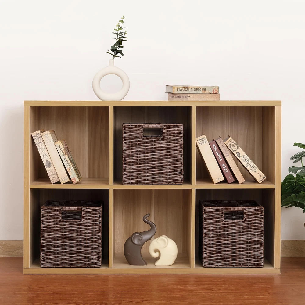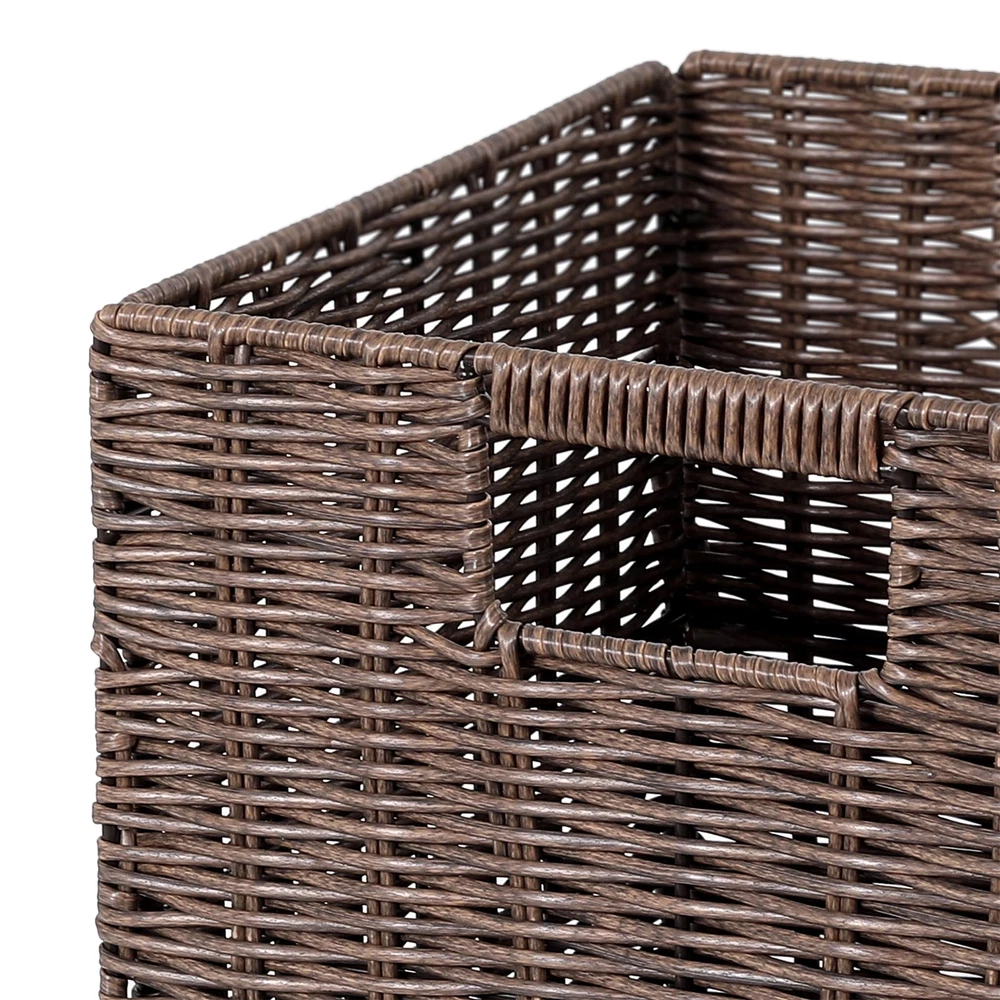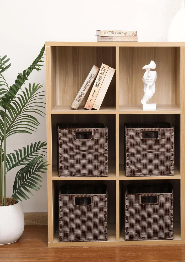 BUILT-IN HANDLES:Our 10.5 in cube wicker baskets with cut out handles which makes these baskets easy to carry from room to room, and its collapsible design makes them easy to store when not in use Material:Handwoven with plastic material, durable and strong bearing capacity.We recommend storing baskets when not in use, they fold for easy storage Size:10.5"L x 10.5"W x 10.5"H, suitable for kallax cabinets with an inner diameter of 10.75 inches or more. (Please know the size of the basket before purchasing to avoid that do not match your shelves and cause you the trouble of returns.) Multipurpose Use:These wicker storage bins are brilliant for storage under tables, or as drawers for square shelves & Kallax. They can store many household items, such as food & snacks in your kitchen, or pillows and clothes in the bedroom. Please Note:please allow a 1/4" measurement tolerance; Suitable for indoor or outdoor use .
