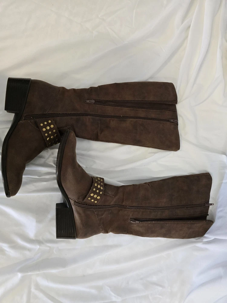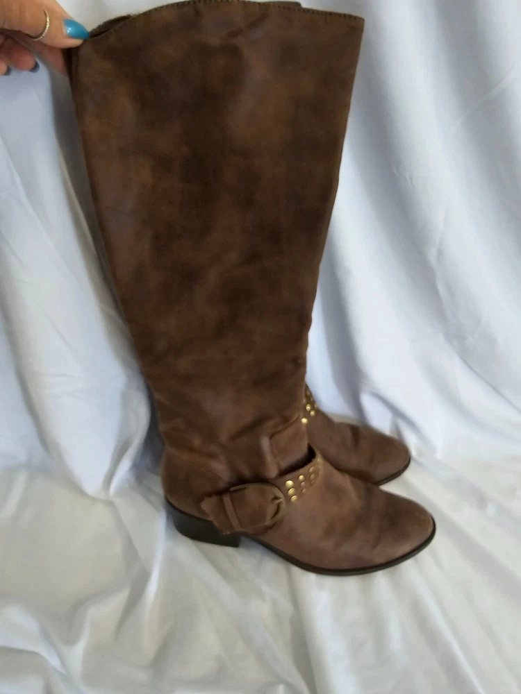 These boots are good for dress casual or riding, adjustable width calf, comfortable sole and around the calf. Barley worn. Size 9.5