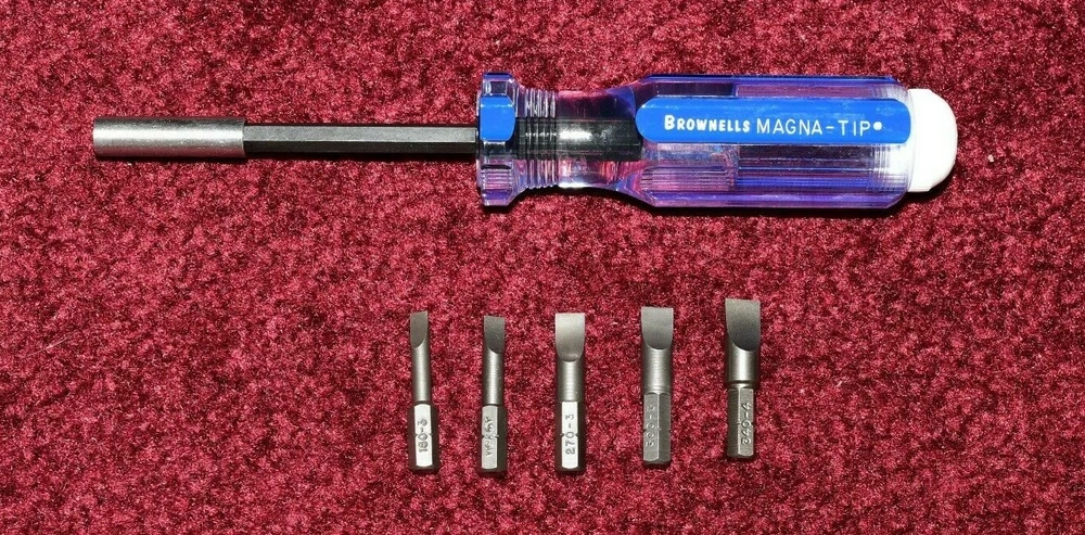 Brownells Magna-Tip Colt SAA Screwdriver Set. Self-Storing, Carry Along For 'Smiths & Shooters On the bench or in the field, you’ll have the right screwdrivers for your gun in one compact, go-anywhere package. We precisely matched each gun’s screws to the correct Magna-Tip ® bits to give you the best possible, blade-to-slot fit. Each set comes with a magnetic socket, Hollow Handle for easy, on-board storage of the bits. Five bits to fit all the screws on Colt Single Actions and popular clones. Shipping USPS First Class Mail.