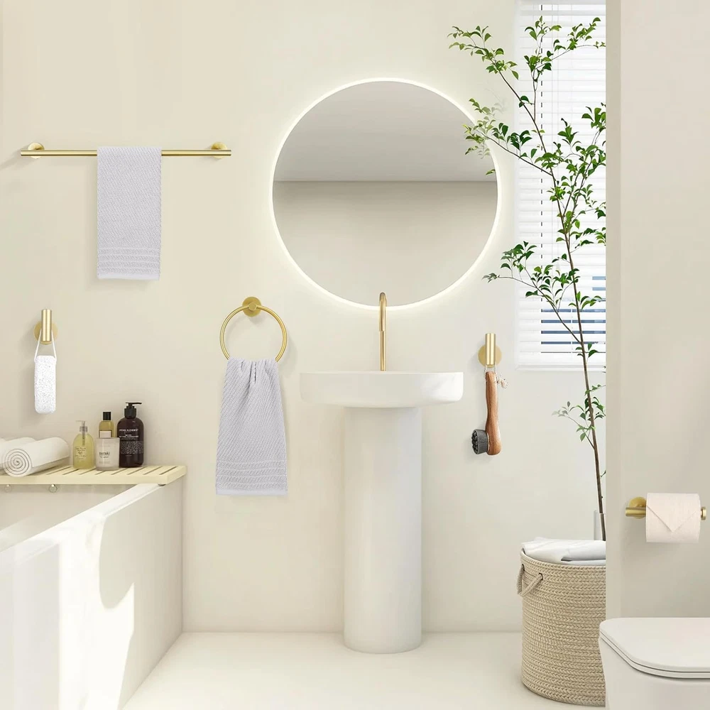 【Perfect Towel Bar Set】-Includes 23.6" towel bar,towel ring,toilet paper holder and 2PCS Robe Hook. Has everything you need for your bathroom. 【Material】-The bathroom towel bar set constructed from SUS304(18/8) stainless steel which prevents rust and corrosion in your bathroom for long lasting durability. 【Warm Tip】-With a new coating technology, the golden appearance will have different color changes under different lights. So, please select the appropriate installation location. And screen display colors may vary slightly depending on the device. 【High cost performance ratio】-This perfect towel bar set combination will not make any products idle,suitable price with good quality. We believe that the main reason to retain customers is always quality,so we attach great importance to the quality of each product. 【Wide Application】-the bathroom hardware set for bathroom, which is ideal for bathroom, outdoor shower and remodeled bathroom closet, kitchen cabinet, Laundry room, sitting room, etc. Product description TURS Provides Variety of Bathroom Hardware for You We use high-quality stainless steel materials, through a variety of procedures and a variety of processes to create a variety of contemporary fashion. For so many years, we always adhere to the original heart, because we believe that good materials to build good products, good products can get good reputation, with good reputation can go further on the road to progress Towel Ring Easy to grab the towel, quick drying the towel Resist spot, easy to clean to keep tidy, you can use it for a long run Toilet Paper Holder Upgraded to prevent big roll paper from falling off. Can be installed horizontally or vertically The gold finish brings modern allure and beauty to your bathroom or kitchen Towel Hooks Quantity: 2-Piece towel hooks Sleek & modern design for hanging towel, robe in bathroom, and washcloth or utensil in kitchen. Designed with clean lines and sturdy construction Upgraded Single Towel Bar Please assemble the single pole first, and then install it on the wall. Please note that : when assembling the single bar, DO NOT rotate it too tightly to ensure that the two bases can fit well to the wall