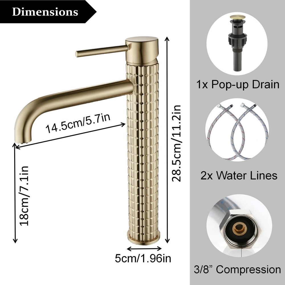 Brushed Gold Bathroom Faucet - Vessel Sink Faucet 1 Hole Single Handle - Brass Bathroom Vanity Faucet with Pop Up Drain 【Durable Material】 bathroom faucet is made of Solid Brass, which resists rust and corrosion in humid bathrooms, ensuring good durability. 【Elegant Style】 Brushed gold surface is waterproof and long-lasting, and will not leave fingerprints. Add a touch of elegance to your bathroom with this beautiful vessel sink faucet. 【Water Saving】 Vessel sink faucet comes with a high-quality ceramic cartridges with superior sealing performance and high tensile strength, which can be tested 500,000 times without losing water. 【Installation&Accessories】 US Standard water supply lines, pop up drain (without overflow) and brass hose fitting are included in the packaging. Single hole bathroom faucet is suitable for bathroom sinks, RVs, commercial bathrooms, etc. 【After-sales】All our bathroom sink faucets enjoy lifetime warranty services. If you have any quality problems, we provide replacement and return services.