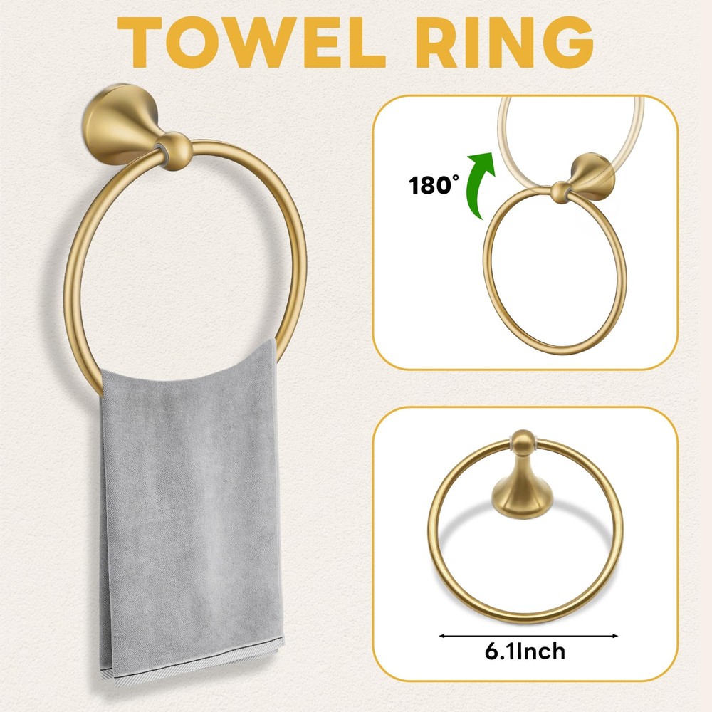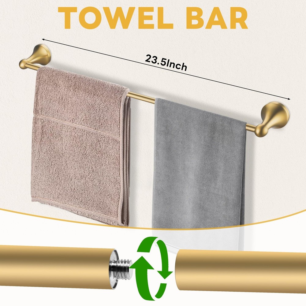 HIGH QUALITY: 4 pieces brushed gold bathroom hardware set are made of SUS304 stainless steel, anti-rust and anti-corrosion, ensuring durability and dependability NICE LOOK & KEEP NEW: Gold bathroom hardware kit prevents rust and corrosion for long lasting durability, make your bathroom more luxury, nicely matches with your gold fixtures. BEAUTIFUL APPEARANCE: Modern design, classy style. Concealed screws design. makes it clean looking. Perfect for use the pieces individually in other bathrooms, kitchen or bedroom. 4-PIECES BATHROOM ACCESSORIES SET: Package includes includes: 23.6 inch towel bar, Hand Towel Holder, toilet paper holder, robe hooks. EASY INSTALLATION: Come with all the mounting accessories needed for easy installation 4-Piece Bathroom Accessory Set: Gold bathroom hardware set includes 60cm towel bar, towel ring, toilet paper holder and towel hook, meet daliy bathroom using High Quality Material. Brushed gold bathroom accessory set is made from high quailty stainless steel and zinc, solid structure and rustproof Well Designed: Classy style and smooth surfaces, concealed screws design wall mounted make it clean looking Easy Installation. Come with all the mounting accessories needed for easy installation, just follow the directions to install Multi-Function: This gold hardware set not only perfect for bathroom but also fit for room or kitchen, which can save more space in your home