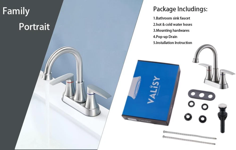 Menu Other Items Feedbacks About Us Contact Us Add To Favorites Brushed Nickel Bathroom Faucet, 2-Handle Lead-Free 360° Swivel High-Arc Spout 4 Inch Centerset Bath Lavatory Vanity Sink Faucets Set for Bathroom Sinks with Pop-Up Drain & Water Hoses Pop-up Drain & Water Inlet Hoses are INCLUDED in package. Dimensions: Overall Height: 8.26'';Spout Height: 5.51'',Spout Reach:4.72'' Exraordinary Quality: Lead-free material. Drip-Free ceramic disc cartridge with 500,000 times cycle testing ensures durable performance in daily life. Humanized Features: Brushed Nickel Finish. 360° swivel high arc spout makes your cleaning tasks much easier. 2 handles design for controlling water flow and temperature precisely. CUSTOMER SUPPORT : We stand behind our product and offer exceptional customer support. If you encounter any issues, Valisy's excellent customer support is always ready to assist you,ensuring your complete satisfaction. Product Description Elevating your bathroom’s look with sleek detailed design, VALISY Two Handles Brushed Nickel Bathroom Sink Faucet provides your bathroom timeless fashion with premium quality, resisting rusting,tarnishing,dripping or leaking. Reliability. VALISY Two Handle Lavatory Sink Faucet 360° swivel high arc spout makes your cleaning tasks much easier. Drip-Free Ceramic Cartridge,Valve: Ceramic Disc Cartridge.Ensure water stream comes out smoothly without dripping and leaking. Durable Premium Brushed Nickel Finish. Handle material: Stainless Steel.Resist rust and Easy to clean without tarnishing,corroding,or flaking off. SIZE Overall Height:8.26'' Spout Height: 5.19'' Spout Reach: 4.84' What will you get from a package? A Bathroom Faucet A Pop-up Drain 2 Water Hoses Moungting Accessories Feature Water Mode: Stream Water Feature: Mixed Hot and Cold Water Pressures: Minimum 0.5 bar, 1.0 bar recommended Durability Durable quality for use. Each VALISY faucet is protected by parts . Item Specification Style Classic Spout Height 5.51 Inches Spout Reach 4.72 Inches Material Type Stainless Steel, Brass Warranty Type limited Is Electric No Number Of Handles 2 Finish Types Brushed Number of Pieces 1 Material Stainless Steel, Brass Model Number VABM80008L Installation Method Centerset Model Name VABM80008L Finish Type Brushed Included Components Pop-up Drain, Water Inlet Hoses Spout Design High Arch Gooseneck Number of Handles 2 Special Features Lead Free Special Feature Lead Free Mount Type Deck Mount Mounting Type Deck Mount Color Brushed Nickel Handle Material Stainless Steel Handle Lever Placement Center Recommended Uses For Product Bathroom Handle Type Lever Dimensions Shipping Returns Additional Info Product Dimensions: 10.28 inches x 12.76 inches x 2.95 inches. Weight: 2.18 lb Fast shipping is very important for us. Our standard shipping service is FREE. Your order will be shipped within 1-3 business days upon full payment received. Most items are delivered within 3-5 business days, however, please allow 3-10 business days. We are shipping only to USA. We only ship to the confirmed Paypal address. We reserve the right to cancel any order for any reason at any time. We are not responsible for undeliverable addresses. We offer a 30 day return policy from checkout winning date. Your satisfaction is guaranteed! If for any reason you are unhappy with your item, just return it within 30 days for a full refund, minus shipping cost. Please contact us prior to initiating a return so that we can issue you a refund authorization. Items defective upon receipt must be packaged in their retail packaging as if new and returned with a detailed description of the problem. Return shipping fees are not refundable. We reserve the right to decline any returns if the above guidelines are not followed. All of our items, unless otherwise stated, will only run on 120 volts. Please check to make sure your country complies with these specifications. If you have a problem or question regarding your transaction please contact us before leaving any type of feedback. We will work with you to resolve any problem you may have.