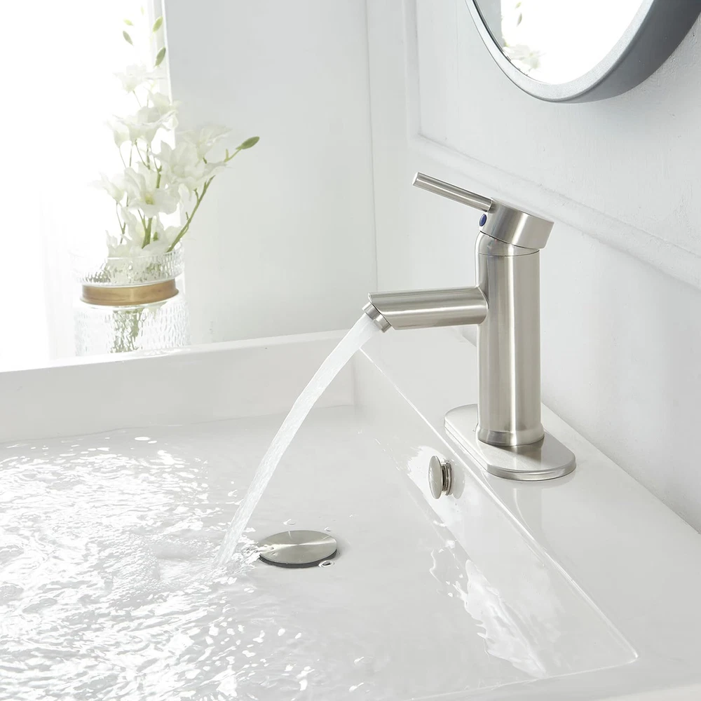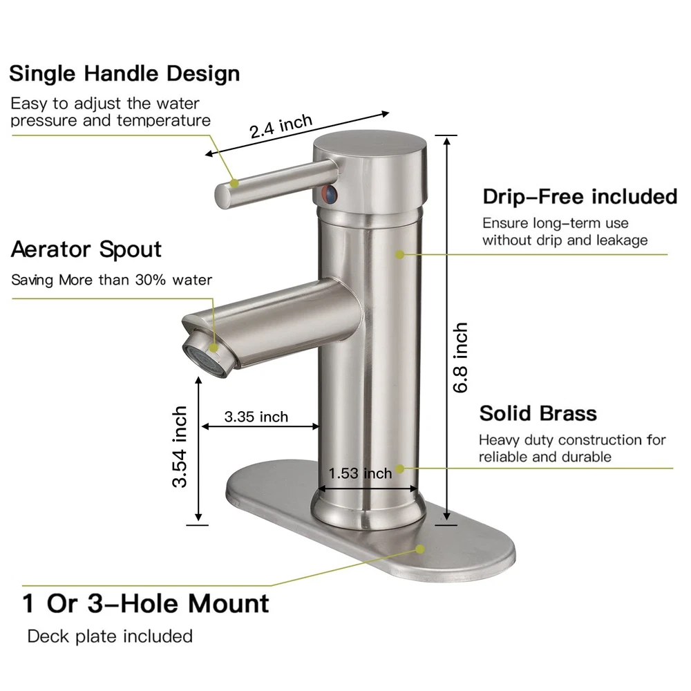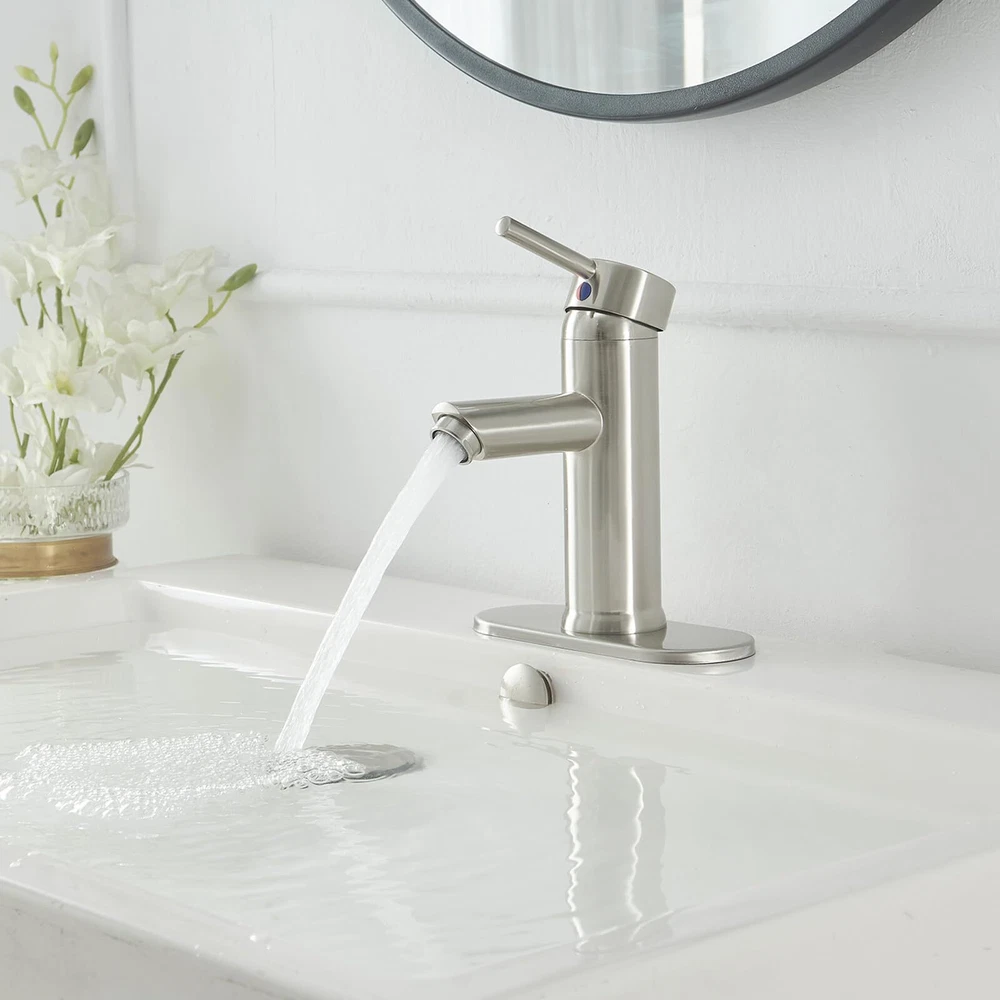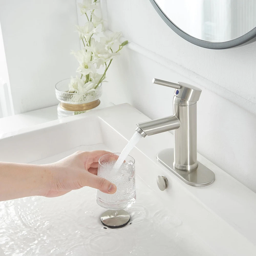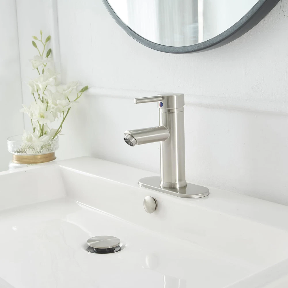 Faucet aerator provides a comfortable smooth washing experience, enough force to rinse well. Which will reduce impulse force of the water and significantly save water for your daily life and provide you with the most comfortable using experience. Single handle bathroom vanity sink faucets with effortless flow and water temperature control, making it more convenient for your daily life. Aerated flow is ideal for everyday bathroom tasks, like brushing teeth and washing hands. With the subtle curves and edges, the design fits seamlessly into an array of environments and with either round or square basins. Lead-free solid brass construction bathroom faucet body, ensures quality and longevity.The material can not only prevent tarnishing and rusty but also keep you and your family safe from harmful chemicals. High sealing ceramic cartridge,have drip-free performance. The accessories and tools we installed are included in the package. After receiving the package, check whether there are 2 pcs 3/8" hoses, 1 faucet, 1 pop up drain and some fixed hardware. Super easy to install and clean. You can install it yourself without a plumber and to save money and time. Beautiful brushed nickel finish, providing a lightly brushed warm grey metallic appearance. And has a modern design style, easy to clean. Lavatory sink Bathroom faucets are built to resist scratches. It will give the bathroom faucet a permanent new look.