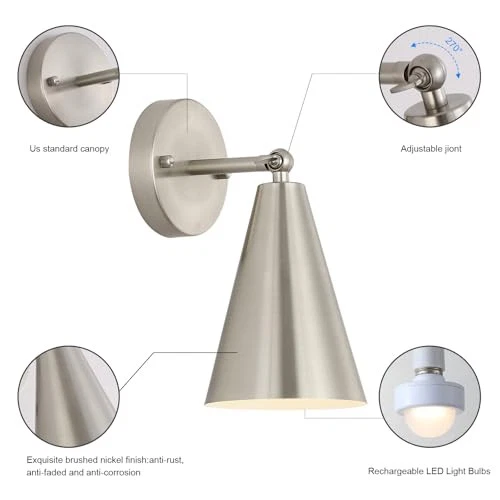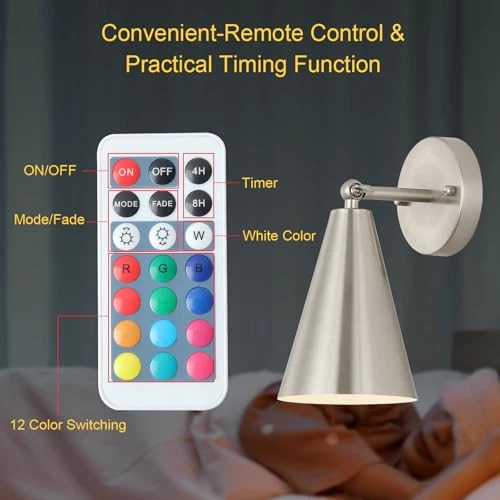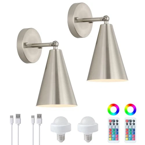 Menu 1. We require immediate payment. 2. We currently accept payment via eBay managed payments only. 3. Once payment is cleared, we will dispatch your shipment within 1-3 business days. Please refer to the "Shipping" tab for more information regarding shipping speed to your destination. Brushed Nickel Battery Operated Wall Sconces Set of Two,Wireless Rechargeable Led Lighting with Remote Control, Modern Dimmable 12 Color Temperatures Adjustable Angle Lamp with Silver Metal Shade Product description No Wiring Required & Easy to Install::This brushed nickel wall sconce easily lights up any wall space with the included a Led 1500mAh rechargeable battery bulb , these wall lamps can light up your space for 10-12 hours on a full charge., no wiring required.Accessories and installation instructions included,add luster to your home easily Modern Farmhouse Style:This indoor brushed nickel wall sconces combines modern and farmhouse, which makes it a perfect decor for your stairs,bathroom, living room, corridor, coffee shop, office, mirror etc Design:This interior silver wall light is stylish cone lampshade shape, combination of minimalist geometry and elegant streamlines, breaks the visual balance of the space and creates a high-level decorative interest Adjustable Angle:Industrial wall sconce 2 pack features 240 degree adjustable head, which can meet your need of lighting 12 Color Temperatures and Adjustable Brightness:This silver wall light offers 3 color temperatures (Warm, Warm White, and Daylight White), 12 RGB colors, and 2 dynamic modes, you can easily switch between these options using the remote control to create your preferred atmosp. Or simply press the bulb shade to toggle the color temperature and turn the light on or off, as the wireless wall sconce also features push-button touch functionality. Additionally, the brightness of this Led wall light can be adjusted from 25% to 100% Quality and Durability:This lamp equipped with sturdy die-cast metal, you do not worry about aging, bent or color fading problems. PLEASE MESSAGE US IF YOU HAVE ANY OTHER QUESTIONS, AND MANY THANKS FOR READING ALL OF THIS. Copyright ©#. All Rights Reserved.