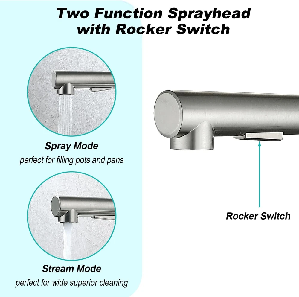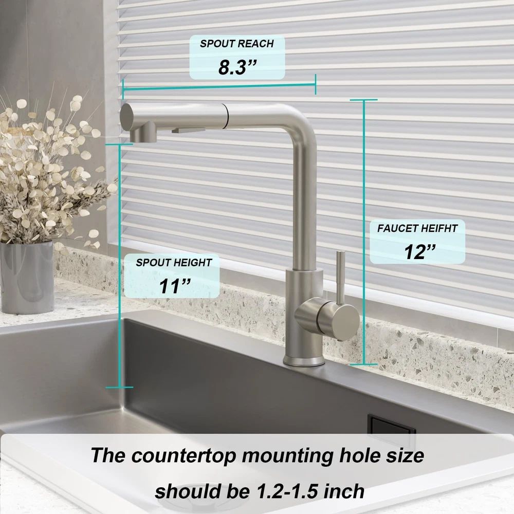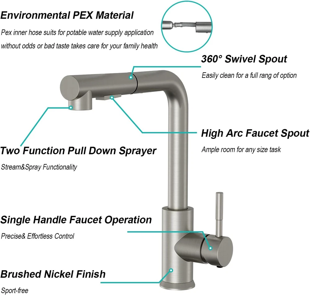 Store New Arrivals Add to Favorite View Feedback Contact Brushed Nickel Kitchen Faucet with Pull down Sprayer - Modern Single Handle Stainless Steel Faucet with 10" Deck Plate, 360° Swivel and Pull Out Sprayer - Perfect for American Kitchen Description Item model number FCG15049NS Style Modern Spout Height 11 Inches Hole Count 3 Spout Reach 15.75 Inches Country of Origin China Warranty Type limited Hose Length 15.75 Inches Batteries Included? No Handle Location Center Number of Pieces 1 Batteries Required? No Finish Stainless Steel Product Dimensions 10 x 4 x 2 inches Material Stainless Steel Installation Type mini_spread, single_hole_deck_mount, Single Hole Or Three Holes Model Name Brushed Nickel Kitchen Faucet with Pull Down Sprayer Finish Type Stainless Steel Included Components Deck Plate Spout Design High Arch Gooseneck Number of Handles 1 Item Weight 4 pounds Is Electric No Special Features 360 Swivel Special Feature 360 Swivel Valve Type Disc Valve Part Number FHW15049THNS Mounting Type Deck Mount Color Brushed Nickel Handle Type Lever Handle Material Stainless Steel Recommended Uses For Product Kitchen 「Health NOT TO Be Ignored」 : Lead-free construction creates natural and hygienic stainless steel kitchen faucets to ensure your water is always clean! This kitchen faucet with pull down sprayer is made of 304 stainless steel and food-grade PEX inner, eco-friendly and durable. Upgrade your kitchen with this high-quality kitchen faucet that is perfect for any kitchen decor. 「Multi-Function Sprayer for Pull Down Kitchen Faucet」 : ARRISEA kitchen faucet comes with a three-function water sprayer. Stream modthreee for daily cleaning and tasks. Spray mode for wide-range rinsing, increasing efficiency by 30%. Pause mode for convenience. You can easily toggle between modes to suit your needs. 「Easy to install」 : The pull-down kitchen faucet comes with most accessories pre-installed for easy installation. Simply use an adjustable wrench to connect the supply line valve. 「Application」: This versatile kitchen faucet can be installed in the RV, kitchen, and bar to effectively clean surfaces. It's also great for washstands for convenient face and hair washing. 「A Perfect Sink Fit Kitchen Faucet」: The brushed nickel kitchen faucet is 12” in height, fitting underneath 99% of kitchen cabinets. It comes with a Deck Plate for 1 hole or 3 holes installations. The high-arc 360° rotatable sprayer with a 30'' nylon hose provides a wide range of washing access. The multi-layer plating brushed nickel finish keeps it free from fingerprints and rust. Product Description 1 KITCHEN FAUCET 2 BAR FAUCET 3 LAUNDRY FAUCET 4 OUT FAUCET Different Kitchen Faucets Add to Cart Add to Cart Add to Cart Customer Reviews 4.1 out of 5 stars 13 3.8 out of 5 stars 6 4.6 out of 5 stars 16 2.7 out of 5 stars 4 Price $25.99 $ 25 . 99 $98.28 $ 98 . 28 — $35.99 $ 35 . 99 Price $59.99 $108.99 $47.99 $55.99 Finish Brushed Nickel Brushed Nickel Brushed Nickel Matte Black Flow Mode Stream/Spray Stream/Spray/Pause Stream/Spray/Pause Stream/Spray/Pause Required Holes 1 or 3 Holes 1 or 3 Holes 1 or 3 Holes 1 or 3 Holes Spout Swivel 360 Swivel 360 Swivel 360 Swivel 360 Swivel Style Morden Morden Morden Morden Features 90° Angle Touchless High Arc High Arc ABOUT US We offer the best prices around on high quality products. Our E-store includes media such as books, movies, music and games while offering electronics, toys, sporting apparel, clothing, tools, general home, garden items and more. SHIPPING We are always working hard to ensure your package arrives as soon as possible. Please understand that some factors like weather, high postal traffic, and the performance of shipping companies are outside of our control. We offer free shipping to the lower 48 states and ship within 2 business days of payment, usually sooner. We do not accept P.O. Boxes. Please provide a physical address. For shipping outside of the continental USA, we only use eBay's Global Shipping Program.The item is shipped to KY and then sent to the rest of the world. International customers are responsible for all duties and taxes. Continue to check out in order to calculate costs for shipping the item to your country. Messages regarding eBay's Global Shipping Program MUST be directed at eBay EXCLUSIVELY. RETURNS We offer a 30-Day Return Policy on items which you are not completely satisfied with. You have the option for a full-refund or an exchange of the item. No returns are available on items shipped outside of the USA. PAYMENT We accept PayPal. CONTACT US This page content is yet to come Please ad us to your favorite seller and visit again later Thank You CUSTOMER SATISFACTION We try our very best to make sure every customer is completely satisfied. If there's a problem, message us! We're happy to help. WE ACCEPT Copyright © 2021 AutoDS. | All Rights Reserved