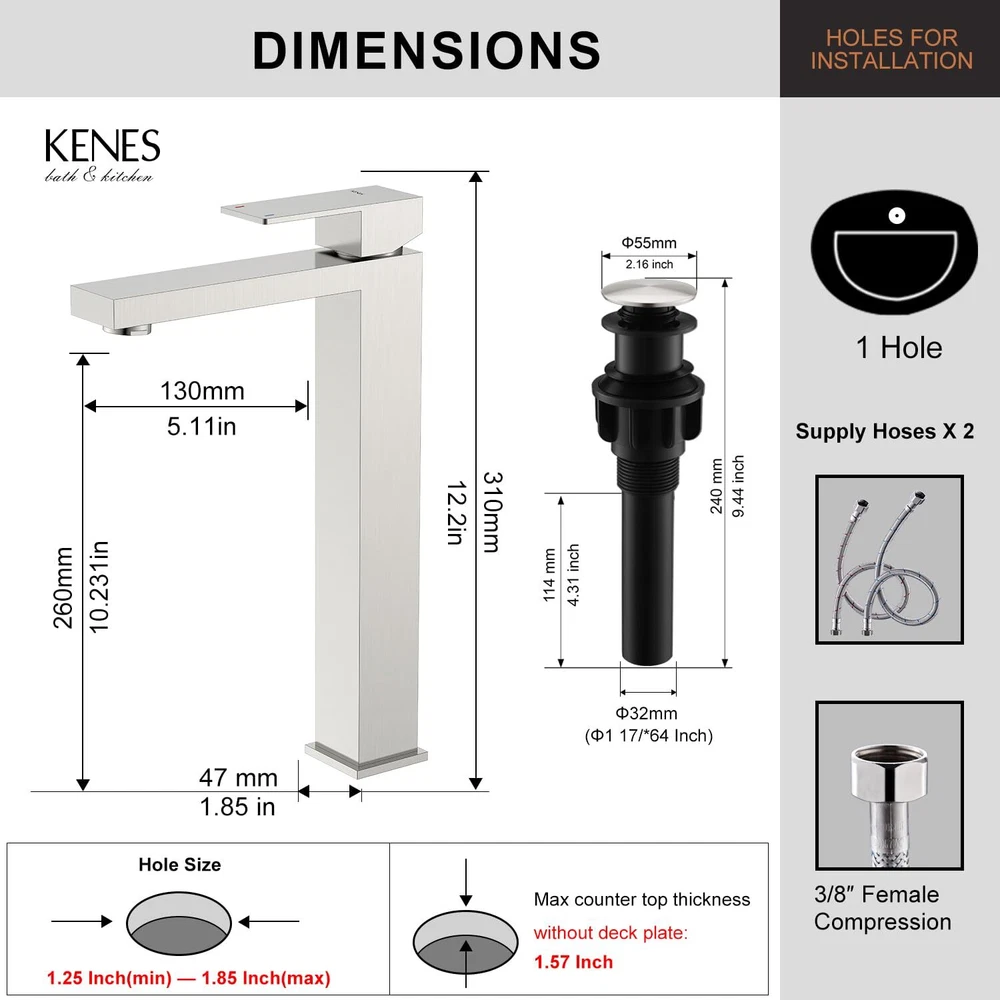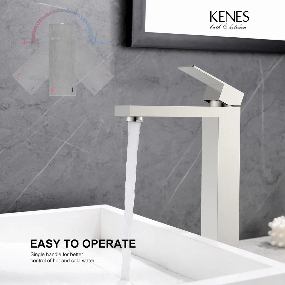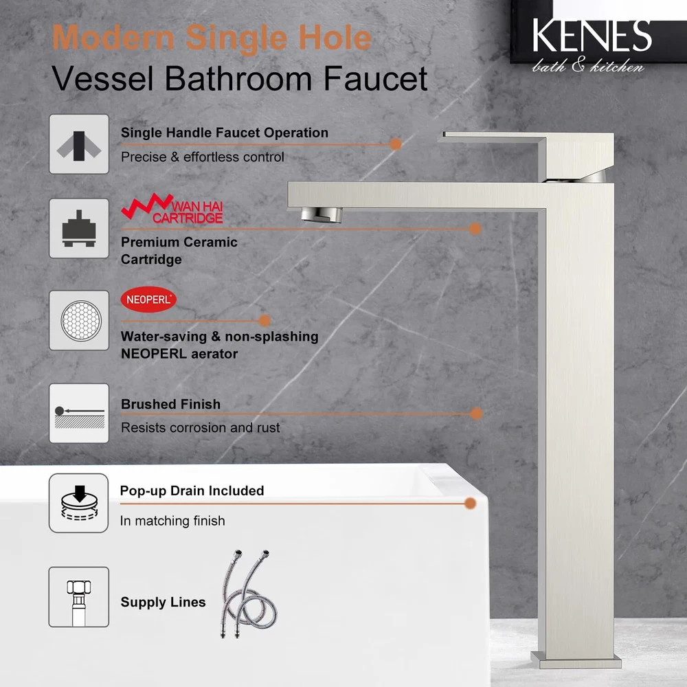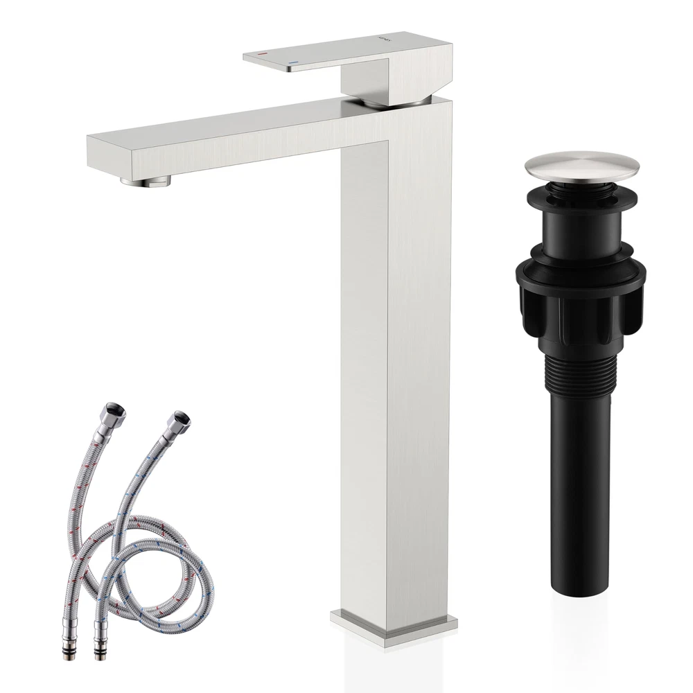 HIGH-QUALITY MATERIALS - The main body of the faucet and the handle are all made of high-304 stainless steel. The -piece faucet body has a longer service life than the faucet made of brass. STAINLESS STEEL TALL BATHROOM FAUCET - Brushed nickel plating has a stylish and elegant appearance, suitable for any style of bathroom installation. The beautiful appearance makes your bathroom a beautiful landscape. IMPORTED NEOPERL BUBBLER - Aerated air flow, no splashing, minimum noise, producing a larger, whiter flow, soft touch and no splashing. You can remove the inflator and clean the mesh. faucets have been 100% tested with pressurized water before leaving the factory. Flow Rate: 4.5L/min (1.2gpm) at 410 kPa CONVENIENT INSTALLATION - American standard installation size, the single-handle bathroom faucet can be easily adjusted to a strong water flow. The overflow pop-up hole makes it super easy to install and clean this single-hole bathroom faucet. The short design allows it to be self-installed using hardware. AFTER-SALES SERVICE - Quality assurance high bathroom faucet is easy to use. team can provide 24-hour support. If you are still in progress, please our friendly service team.