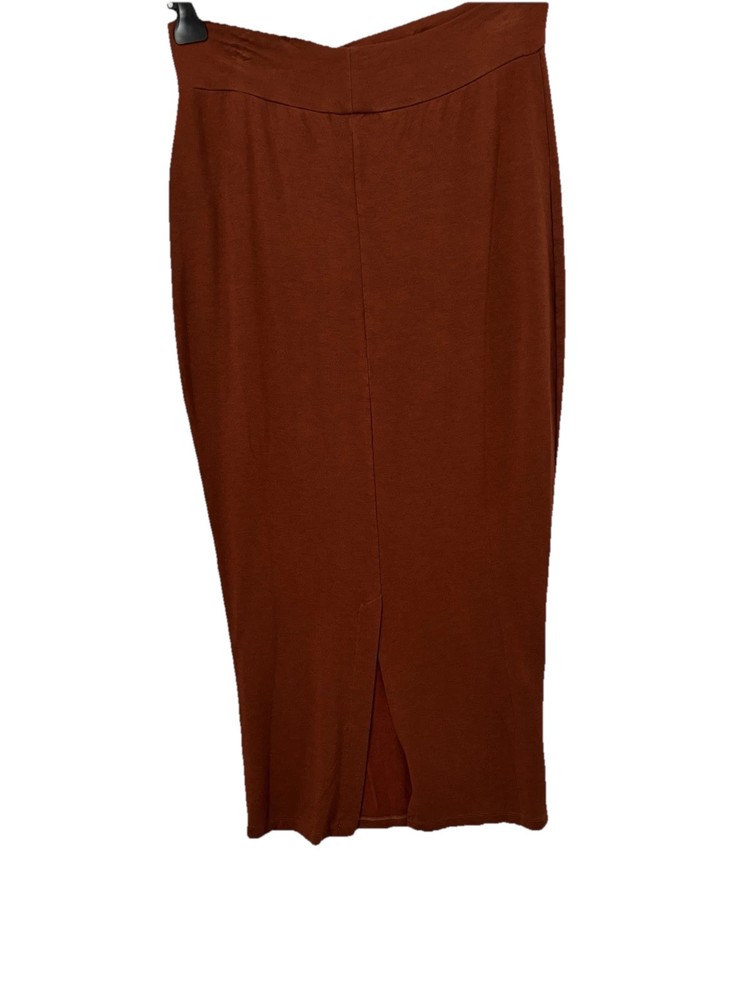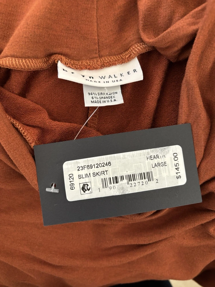 From Bryn Walker, this skirt features: French terry knit fabrication Pencil silhouette Elasticized waistband Straight hemline with back slit Pullover construction Approx. 38" length Siro Rayon/Spandex Machine wash/Tumble dry Made in the USA Waist 34” unstretched Hips 44” unstretched Length 40” if waistband is not folded. 38” if folded over New with tags attached Retail $145