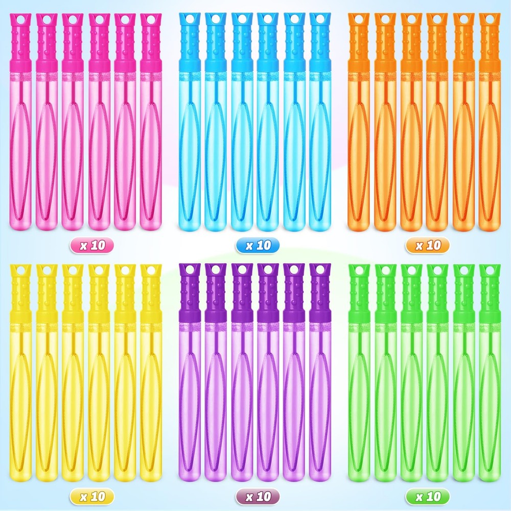 Bubble Wands Bulk 【Value Bubble Wand】Our summer outdoor activities toy include 60 pcs bubble wand in 6 differeent bright colors(orange & blue & purple & yellow & pink & green).Each bubble wand has 2 oz capacity, this 60 pack bubble bottles kids can blow bubble for a long time. 【Bubble Party Favor Supply】Each bubble solution measure about 8.7 inches that suitable for boys and girls to play. 60 bottles are enough for party favor supply & bubble activities game & summer outdoor toy. Boys and girls could have a wonderful bubble time. 【Wide Application】Nobody can refuse the attraction of bubbles, which provides kids lots of fun for summer outdoor activities, summer toy, outdoor game, classroom prize, kids birthday gifts supply, weeding bubble maker, all theme ceremonies. 【Summer Bubble Toy】Kids just put the bubble wand into the bubble solution, wave wand through the air or blow the bubble wand gently and colorful & abundant bubble float in air.he bubble wand is a big hole design, and kids can blow big bubbles at once and enjoy the fun of bubbles. 【Safe For Kids & Customer Satisfaction】60 pcs bubble wand party favor set made of hight quality material and the perfect size for kids toddler.The bubble solution made of non-toxic and odorless soap solution, safe for kids skin. If you have any questions, please feel free to contact us, we will solve for you immediately.