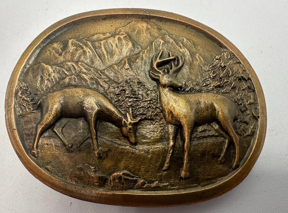 This vintage buckle from Indiana Metal Craft features a beautiful deer design, perfect for any animal lover. The bronze color adds a touch of rustic charm to any outfit. This original piece from the 1970s is a must-have for collectors and fans of vintage accessories. Crafted from high-quality metal, this belt buckle is durable and built to last. The adult unisex design makes it a versatile addition to any wardrobe. Made in the United States, this original piece is a true collector's item. Add it to your collection today!