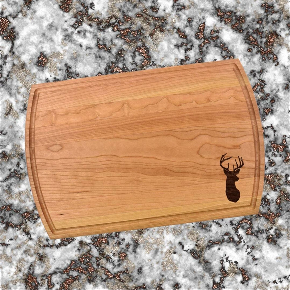 Design: Personalized Buck Deer Silhouette Cutting Board or Charcuterie Serving Tray All items ship via USPS - please make sure your address is correct :-) Whether used as a charcuterie serving tray for snacks or cutting board, our bamboo, walnut and cherry custom boards are the perfect addition for the home and make the perfect gift for your loved one celebrating a birthday, anniversary, new home, wedding, etc! *** FEATURES *** • SIZES: We have multiple styles and sizes available. To see our current sizes available, click the drop-down menu. The photo slide contains a photo showing each side by side. Please note, the board with the juice groove only has the groove on the front side of the board. • THICKNESS: Bamboo Boards - Approximately 1/2" Thick; Walnut & Cherry Boards - Approximately 3/4” Thick • UNIQUE: Every board is unique with the grain and coloring varying throughout - no board is the same! • CARE INSTRUCTIONS: Hand wash only with warm water. Do not soak. Please apply mineral oil throughout the board’s life. • PERSONALIZATION/CUSTIMIZATION: Do you want the text placed differently on the board? Please don’t hesitate to contact us. All personalization notes can be entered in the personalization box when checking out. • SHIPPING: All cutting boards ship within 2 to 5 business days. • WHOLESALE ORDERS: Please don’t hesitate to contact us for information about wholesale orders. Processing times for larger orders may change. • NOTE: Colors can vary a bit on different monitors and screens. Any props included in photos are not included. Please be sure to double-check your address to make sure it is accurate for USPS delivery. If a package is returned to us due to an invalid address, the buyer is responsible for all additional shipping charges. We appreciate you supporting small business – best wishes! For items ordered with simple edits, we do not send proofs since the layout doesn't change from the example(s). However, in the event there are requests that change the layout from the example(s), we do send proofs for approval before making the product. If you'd like a proof before we make the product, please note so in the personalization box.