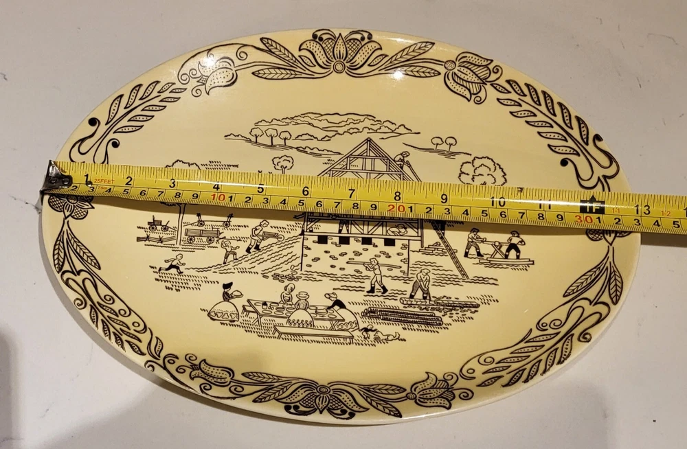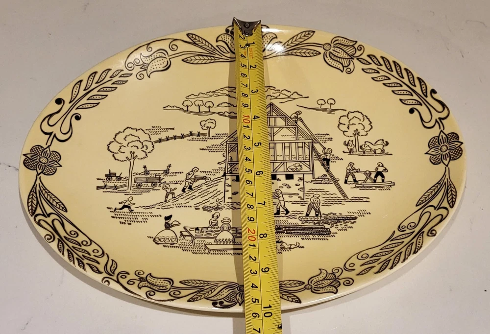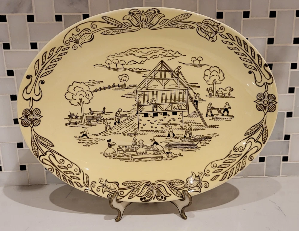 Bucks County Barn Raising Scene Vintage Platter Penn. Dutch Amish Royal 1950s. Very good condition. No chips, cracks, or flea bites, but it does have some crazing on the bottom side. Overall, it is in great vintage condition! See pics for full details and let me know if you have any questions. Thank you!