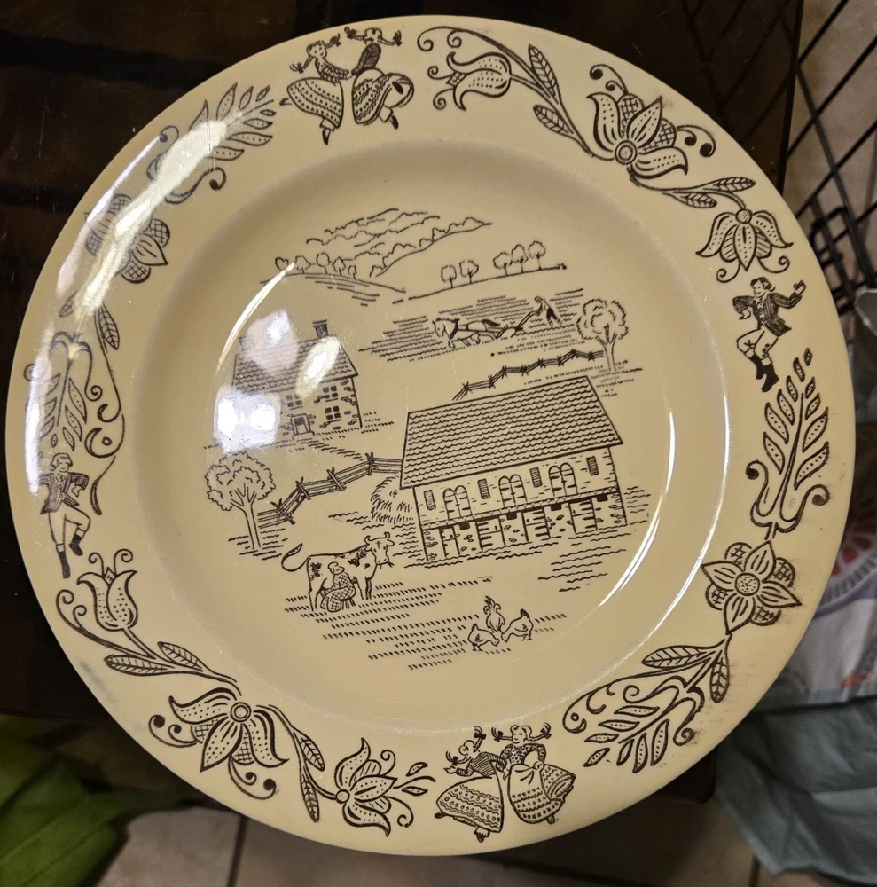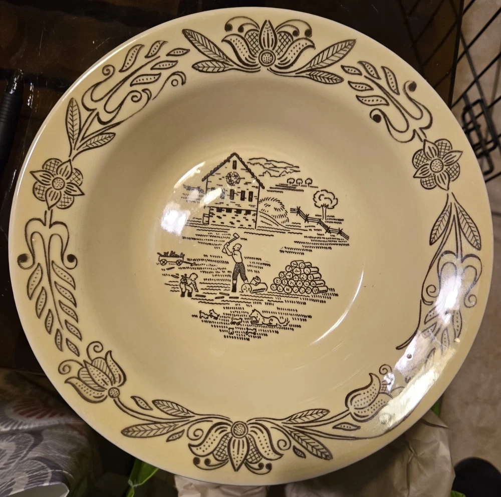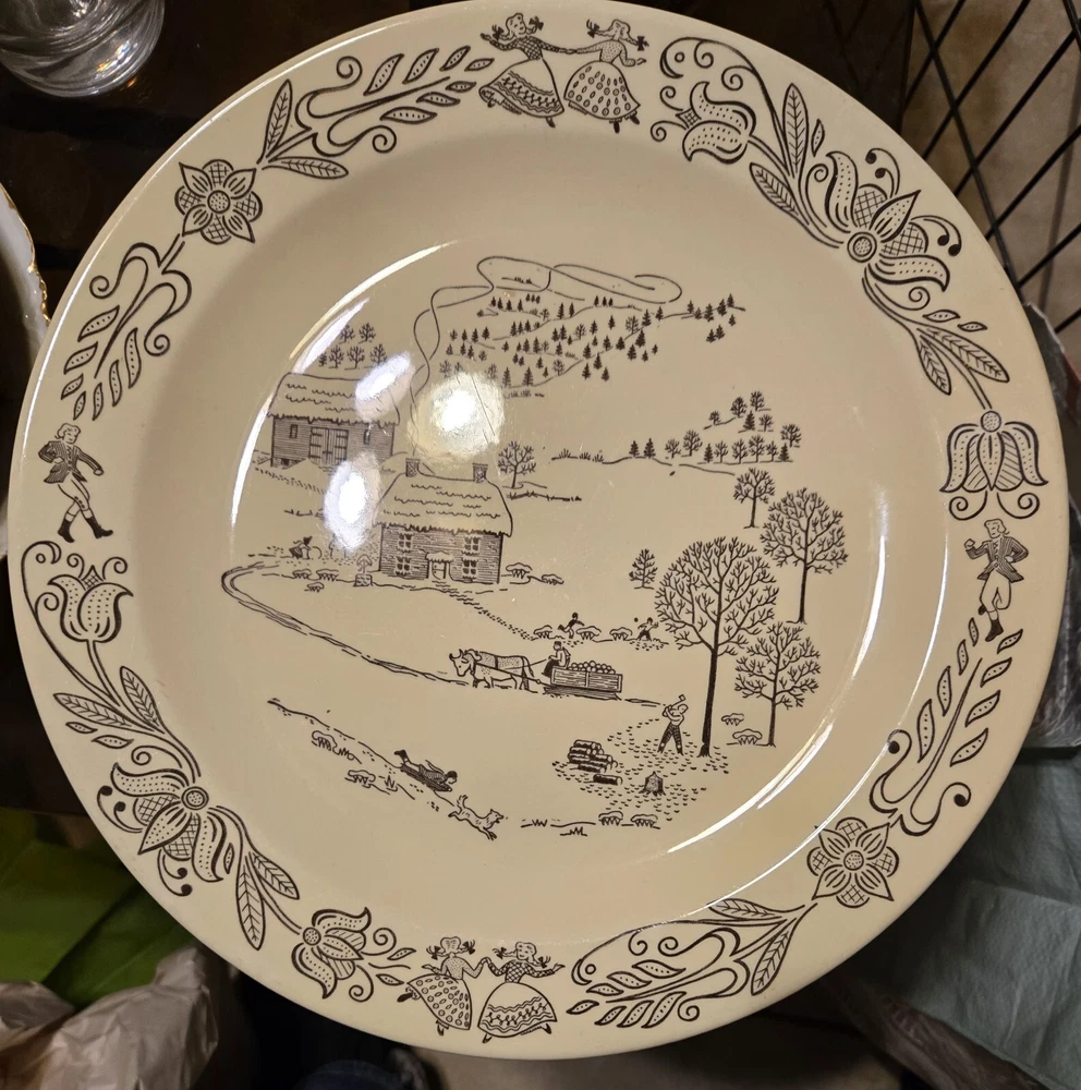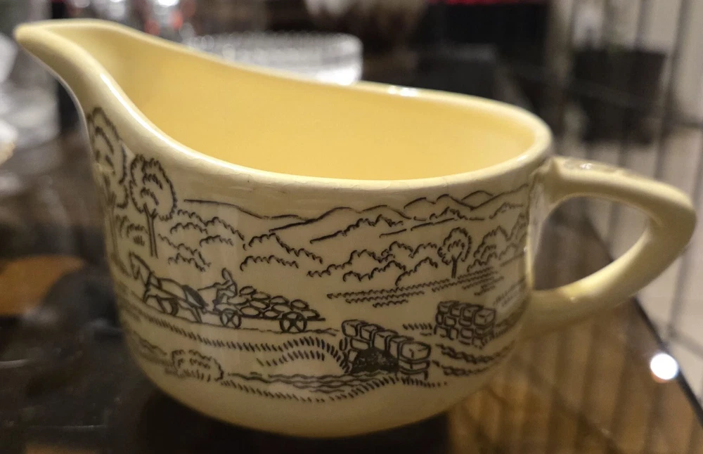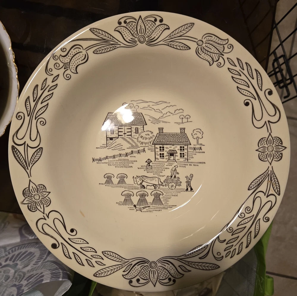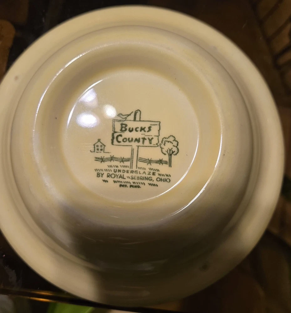 This beautiful Bucks County China Set is perfect for any occasion. The set includes 23 pieces, including platter, desert bowls, creamer, dinner plates, and bread plates. The round-shaped, hand-painted yellow clay material adds a touch of elegance to any table setting. Care instructions recommend hand wash only to maintain the originality and stackability of the set. The vintage art pottery production style and painted backstamp make this set a unique addition to any collection. The set was manufactured in the United States in the 1950s and is an original, handmade piece. Set includes: - 1 Creamer - 3 Small desert bowls - 1 10" bowl - 1 9" bowl - 4 6" bread plates - 6 10" dinner plates - 1 12" platter