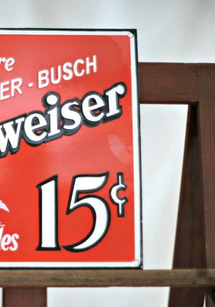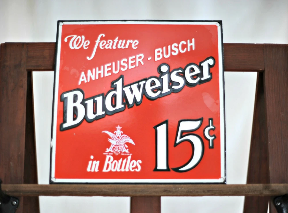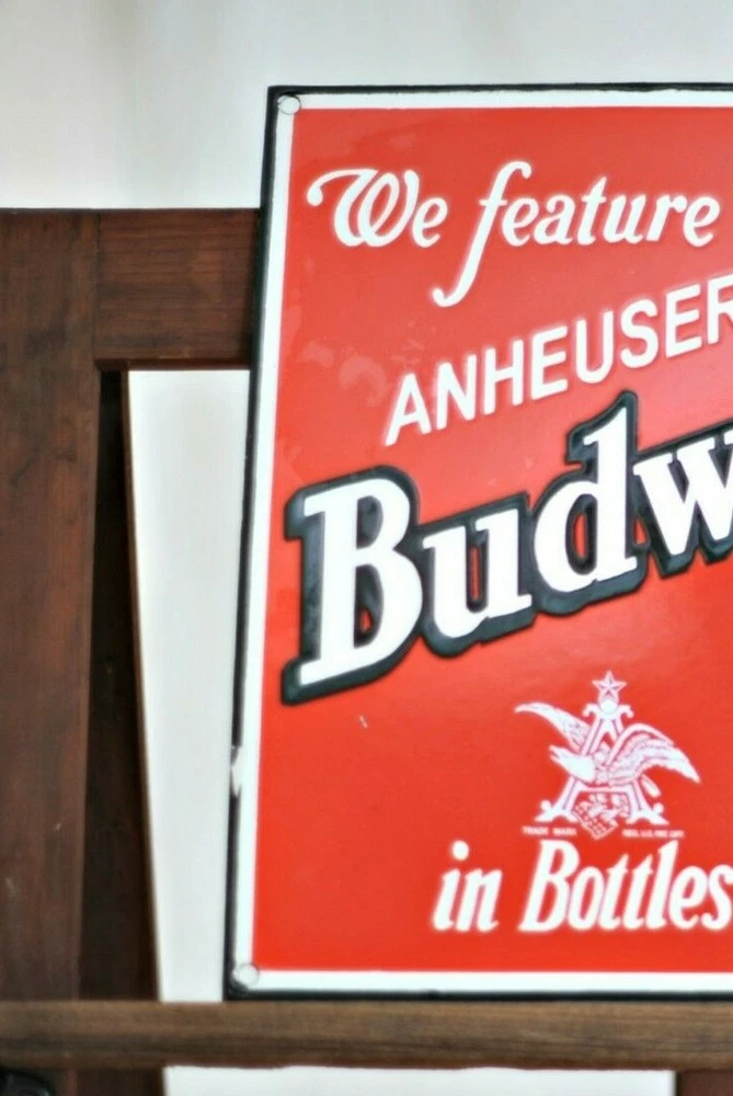 Budweiser Beer Porcelain Sign Soda Pop Fountain Gas Garage Oil 12" X 12" Nice sign with scratches, dings and wear typical of age.