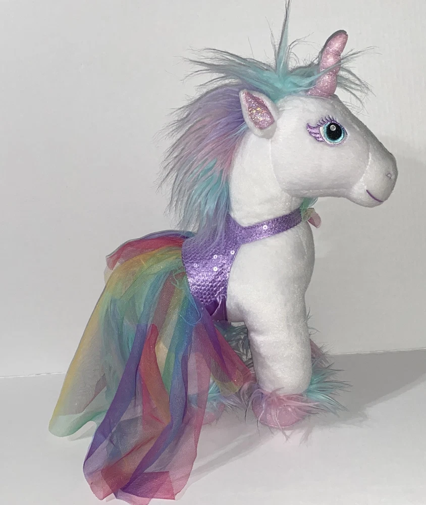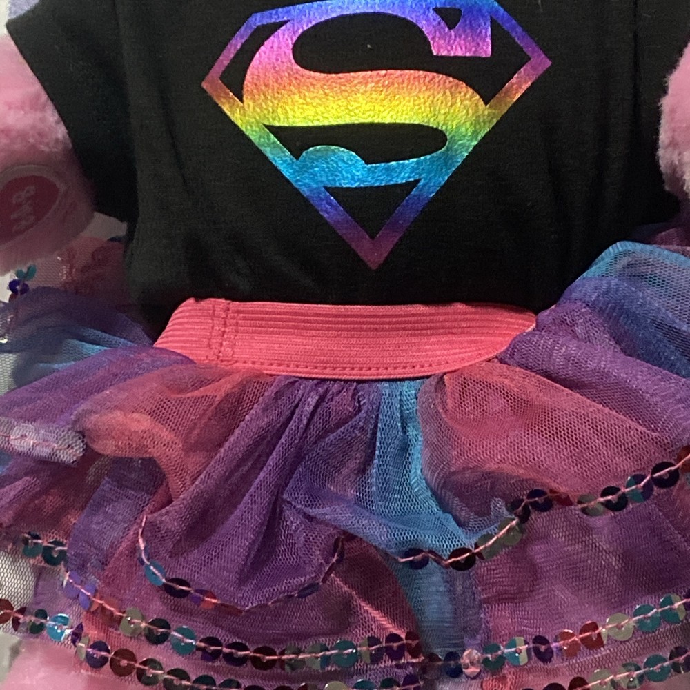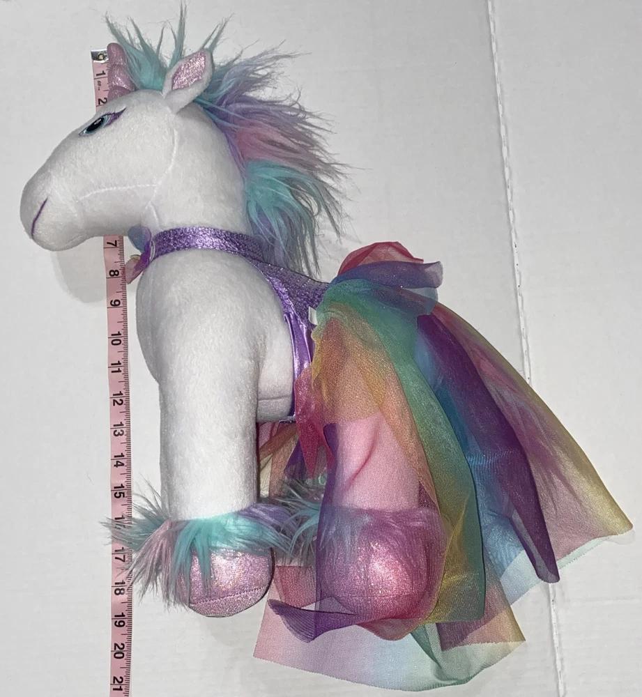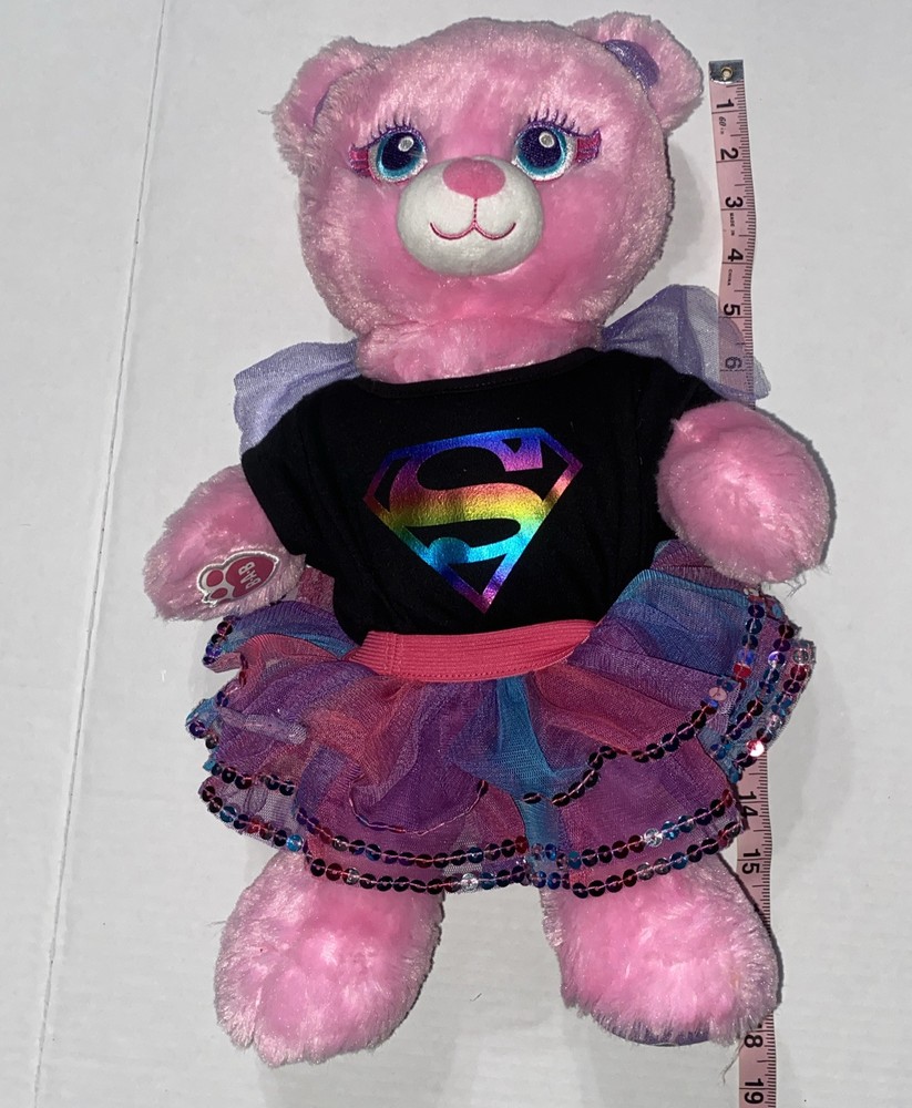 Two adorable Build A Bear Workshop BAB large Fairy Friends plush. The enchanted Unicorn in rainbow is fully dressed and has an extra tutu. It plays a version of “Girls Just Wanna Have Fun”. Pink Bear has a few different sayings when her button is pressed. She is wearing the rainbow Batman outfit. Both are clean and free of holes, stains, or smells.