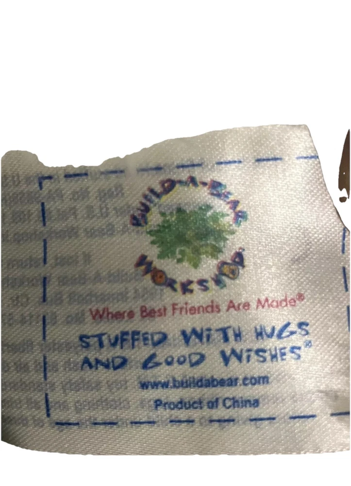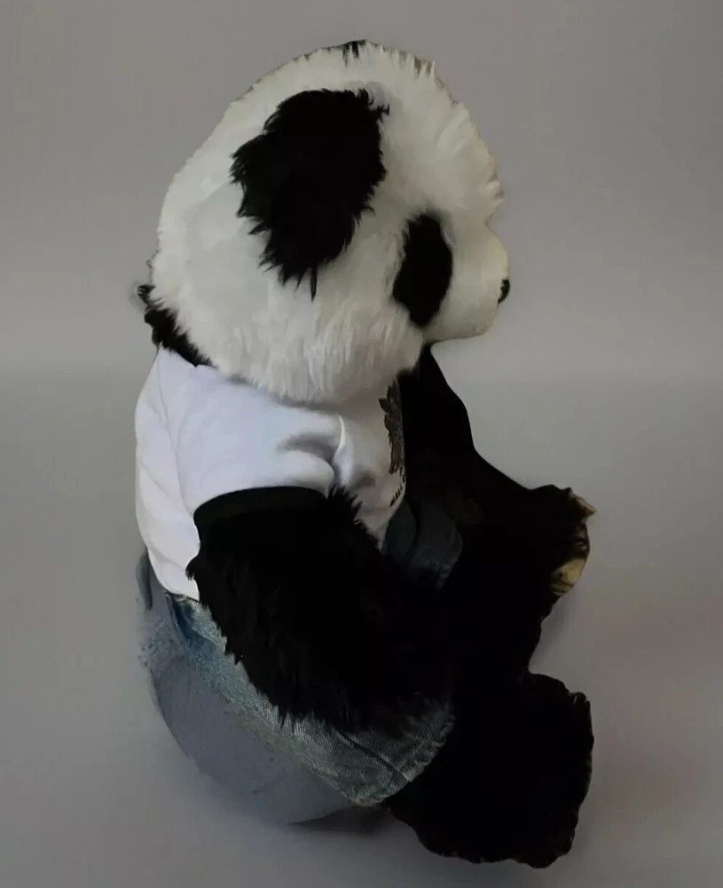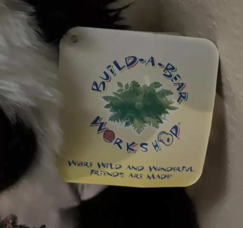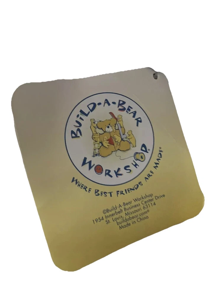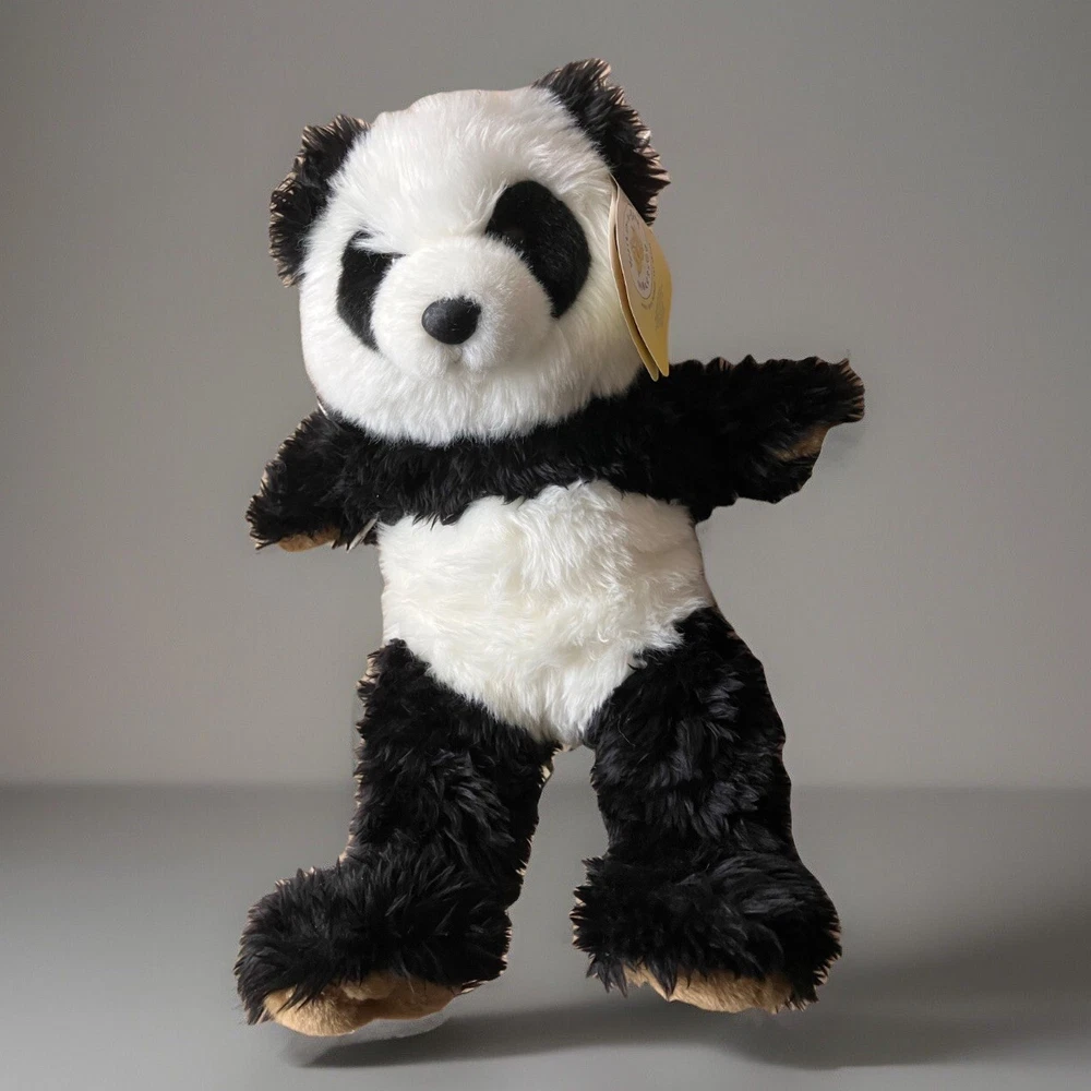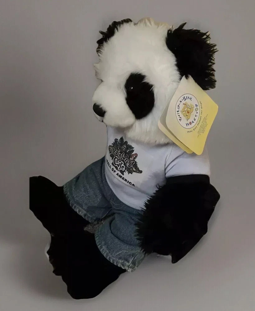 The product is a Build-A-Bear Workshop plush black and white panda bear with Rain Forest clothing from the Minneapolis Mall included. Suitable for kids aged 5-7 years. It is part of the Family & Friends theme. The bear is made of cloth material and is part of the Build-a-Bear franchise. The item is preowned but still has tags attached.