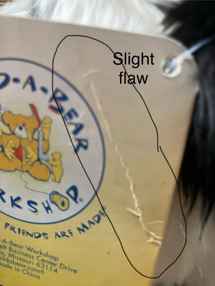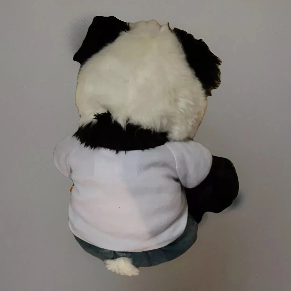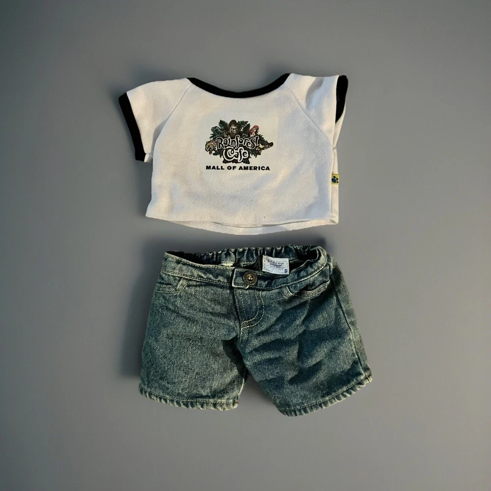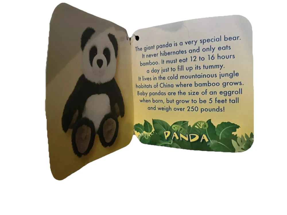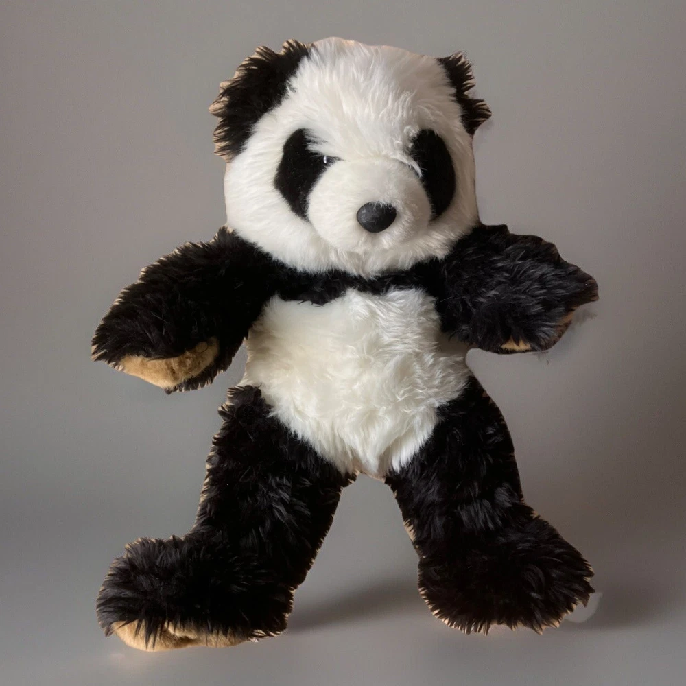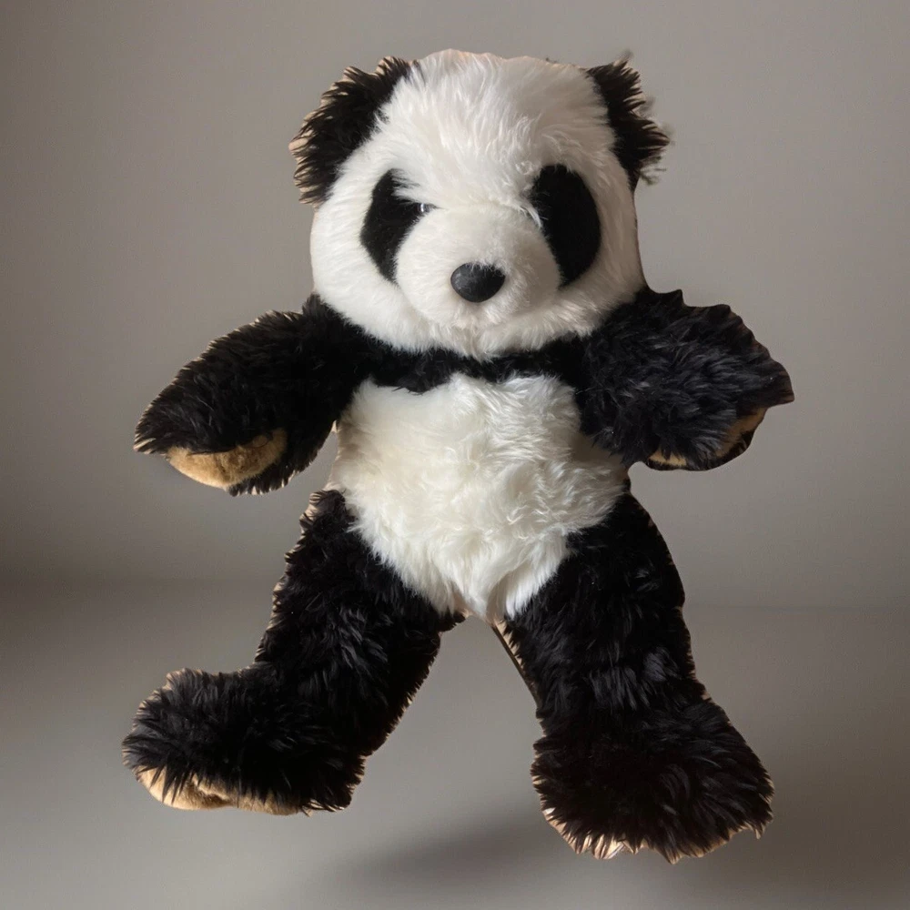 The product is a Build-A-Bear Workshop plush black and white panda bear with Rain Forest clothing from the Minneapolis Mall included. Suitable for kids aged 5-7 years. It is part of the Family & Friends theme. The bear is made of cloth material and is part of the Build-a-Bear franchise. The item is preowned but still has tags attached.