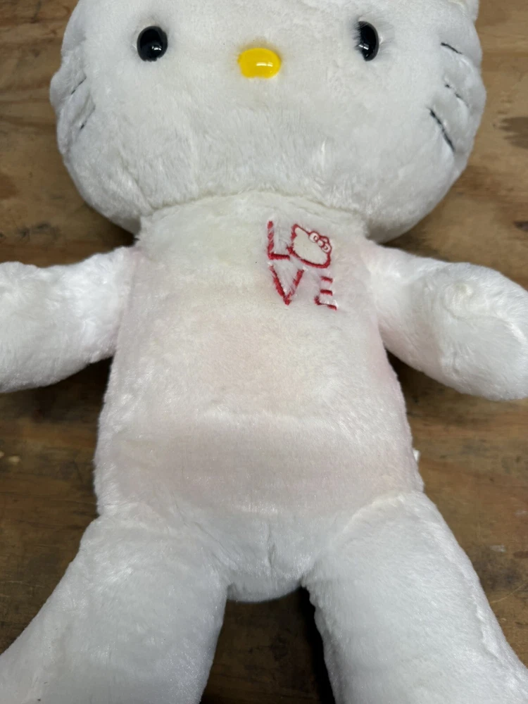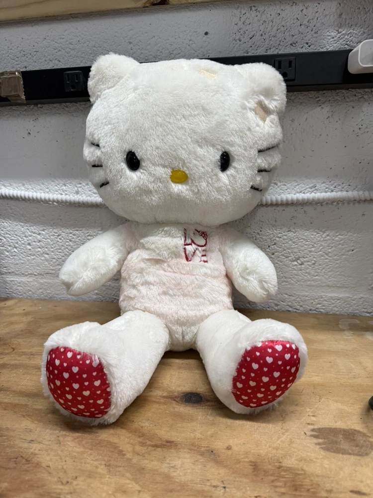 This Build-A-Bear Workshop creation features a 20-inch white Hello Kitty stuffed animal from the Sanrio collection, designed for Valentine's Day in 2012. The plush bear is adorned with cute heart patterns and is a limited edition, retired item. It comes without packaging and does not include the bow accessory. Perfect for fans of Hello Kitty, this original, licensed stuffed animal is a charming addition to any collection. PINK ON BEAR WHERE OUTFIT WOULD BE, SEE PHOTOS. NO OUTFIT OR BOW INCLUDED. FAST SHIPPING.