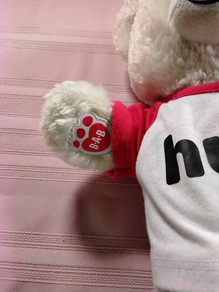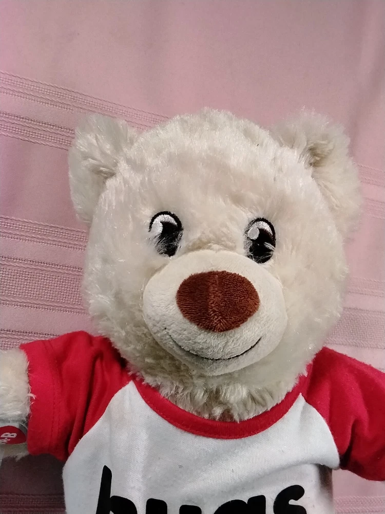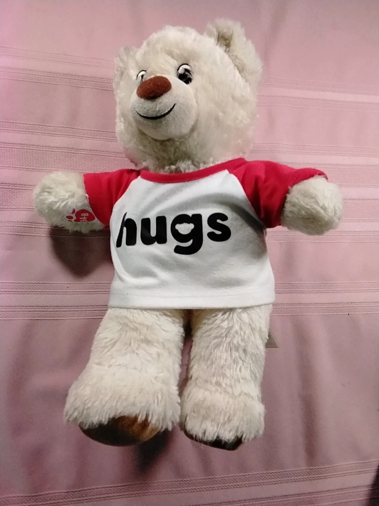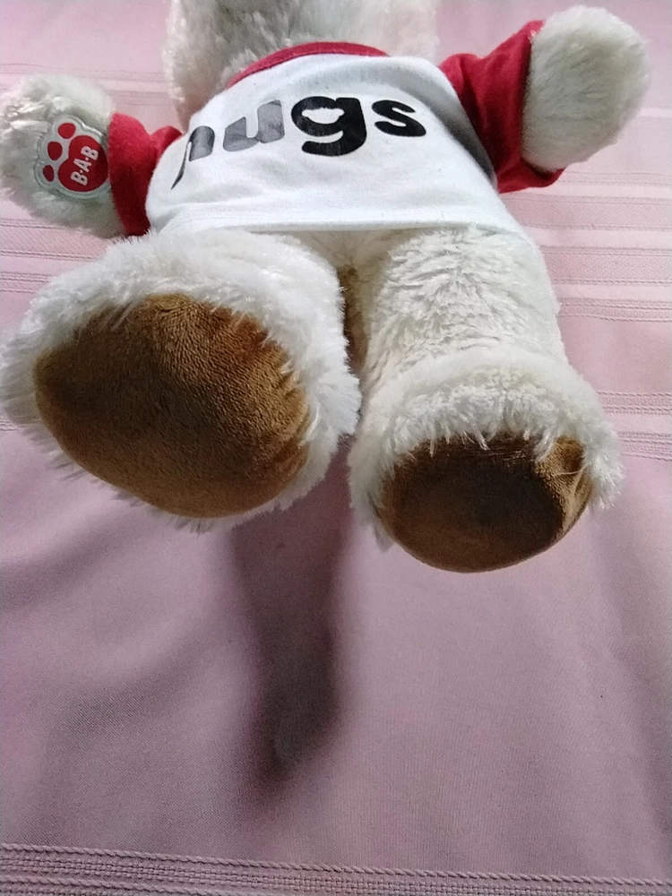 There is some pilling on the shirt. This adorable white plush bear from Build-A-Bear Workshop comes with a cozy Hugs T-Shirt, perfect for snuggling up with. The bear stands at 15 inches tall and has beautiful brown eyes. Made from soft polyester material, this original Build-A-Bear is perfect for any bear lover. As part of the Build-a-Bear franchise, this plush bear is a must-have for any collector or fan. It was manufactured in 2021 and is an original piece. The bear is in excellent condition and ready for a new home. Don't miss your chance to add this cute and cuddly bear to your collection!