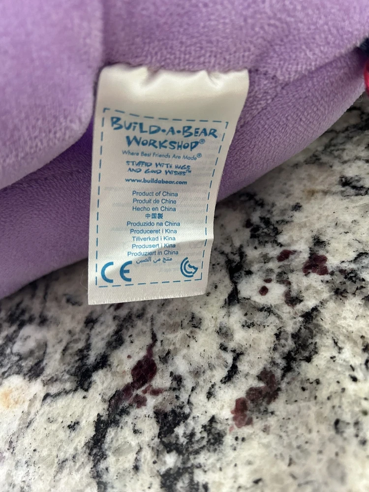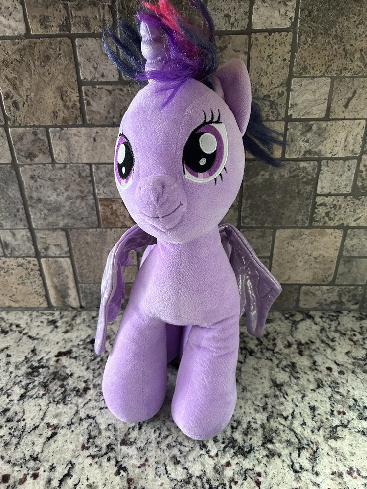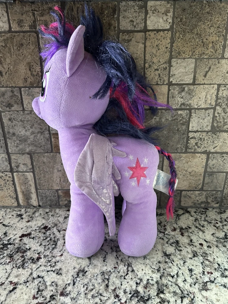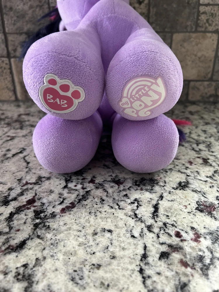This listing is for a rare and highly sought-after Build-A-Bear Workshop My Little Pony plush bear. The bear is 16 inches in size and features a beautiful purple color with Twilight Sparkle's signature pink and purple stripes. This particular bear is a retired collectible item that was originally released in 2013. The bear is made of high-quality plush material and is perfect for any fan of My Little Pony or Build-A-Bear Workshop. This item is in excellent condition and comes from a smoke-free home. Bid now to add this unique and beloved item to your collection!