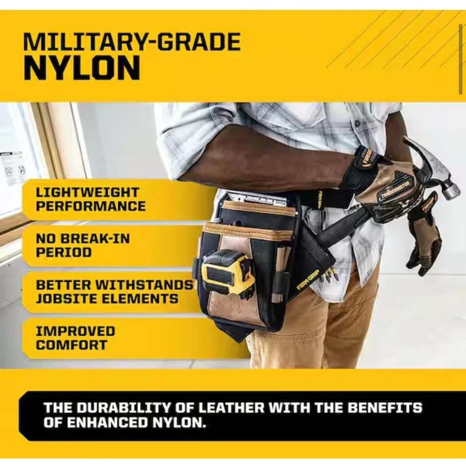 About This Product "Tired of jamming tools in your pockets or carrying around a heavy rig for jobs that don't need it? Lighten up and carry just what you need. The Everyday Belt Kit is a lightweight, modular tool belt system designed for jobs and trades where you need to carry around just the essential tools. Work lighter and more efficiently, while getting into tighter spaces, and customize your Everyday Belt based on the job with an assortment of modular accessory attachments (sold separately).Backed by a Lifetime Limited Warranty, the Everyday Belt Kit is engineered to withstand harsh daily use on the jobsite. The Everyday Belt is crafted with double layered, military-grade nylon, providing necessary structure to support your pouches, tools, and accessories. The quick-release buckle is forged from lightweight aluminum and provides set-and-forget sizing and increased load-bearing strength. The Utility Pouch delivers a compact and lightweight, hybrid design with military-grade nylon for enhanced performance. Key wear points are reinforced with the trusted durability of premium leather. The included Hammer Sleeve tucks behind the pouch providing quick access to your hammer while also protecting the jobsite and your body. Expand your Everyday Belt Kit with a full collection of Build-A-Rig accessories so you can customize your belt for any job.The Everyday Belt Kit is part of the Firm Grip Build-A-Rig system of belts, pouches, and accessories - empowering you to build YOUR RIG, YOUR WAY." Highlights Belt fits 28" to 55" waist sizes Lightweight, modular system includes the Everyday Belt, Utility Pouch, and Hammer Sleeve Hybrid leather and military-grade nylon construction delivers lightweight performance and enhanced durability Quick-release aluminum buckle with set-and-forget sizing and increased load-bearing strength Hammer Sleeve tucks behind the pouch providing quick access to your hammer while also protecting the jobsite and your body Built for the jobsite and backed by a Limited Lifetime Warranty Part of the Firm Grip Build-A-Rig collection of belts, pouches, and accessories Return Policy California residents see Prop 65 WARNINGS Product Information Internet # 329008838 Model # 1FG-3575 Store SKU # 1011429310