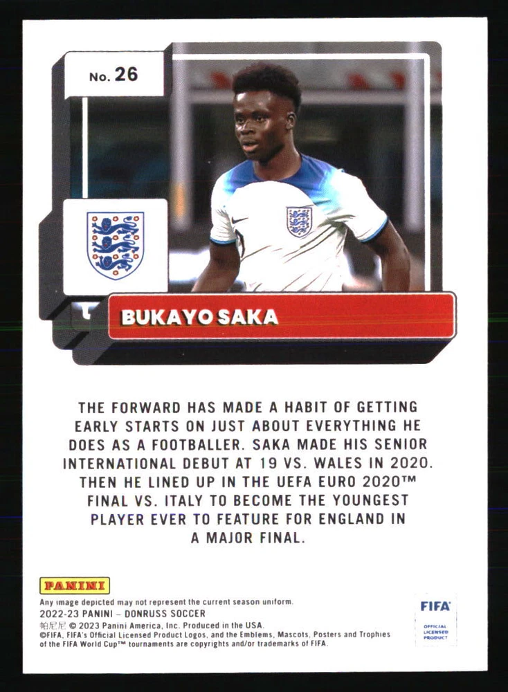 Card Number: 26 Type: Sports Trading Card Player|Athlete: Bukayo Saka Year Manufactured: 2022 Manufacturer: Donruss Season: 2022 Team: England Autographed: No Graded: No Sport: SOCCER Set: 2022-23 Donruss